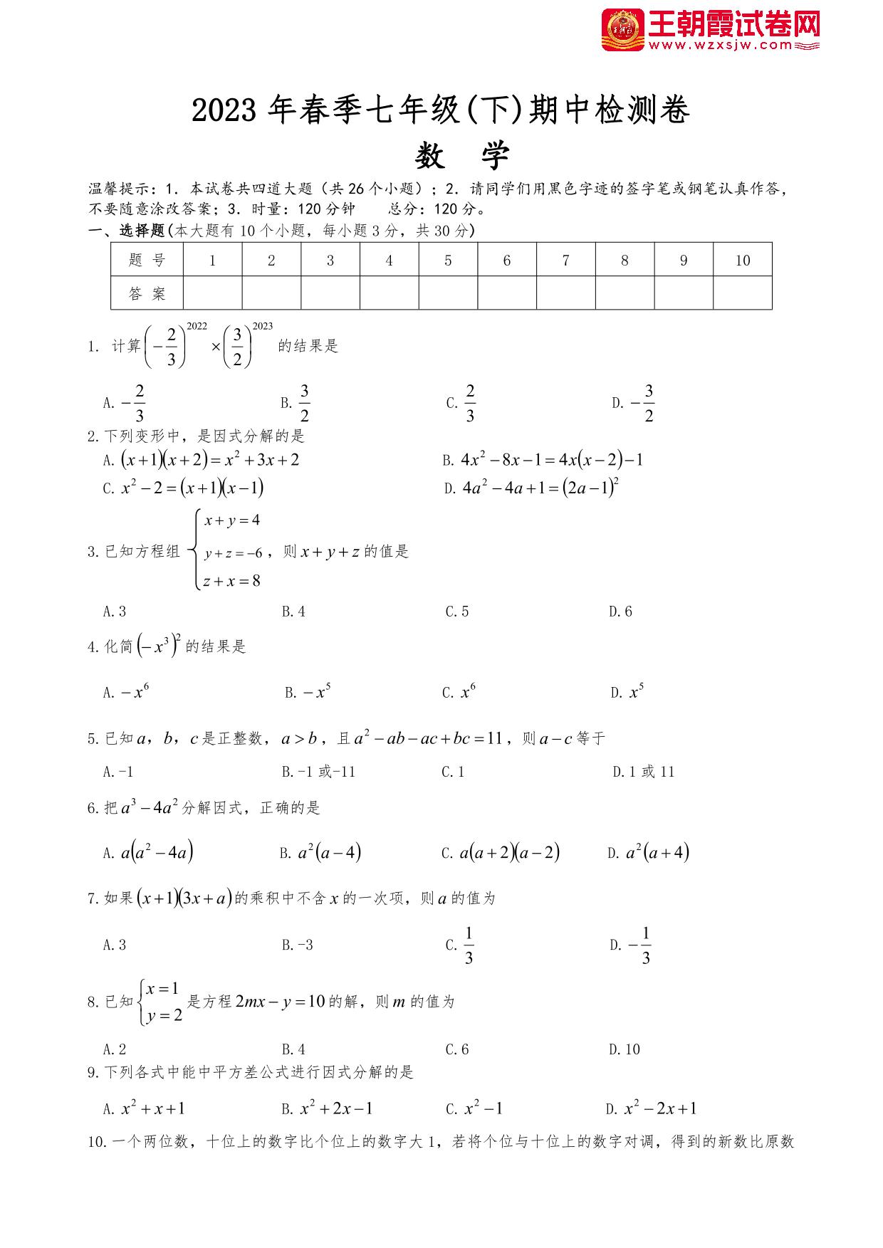 湖南省邵阳市北塔区2022-2023学年下学期期中试卷卷七年级数学(湘教版)