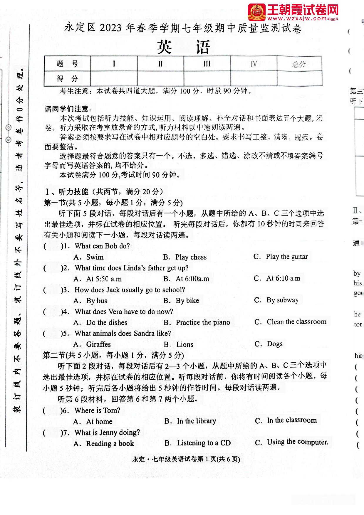 湖南省张家界市永定区2022-2023学年下学期4月期中考试试题七年级英语(人教版)