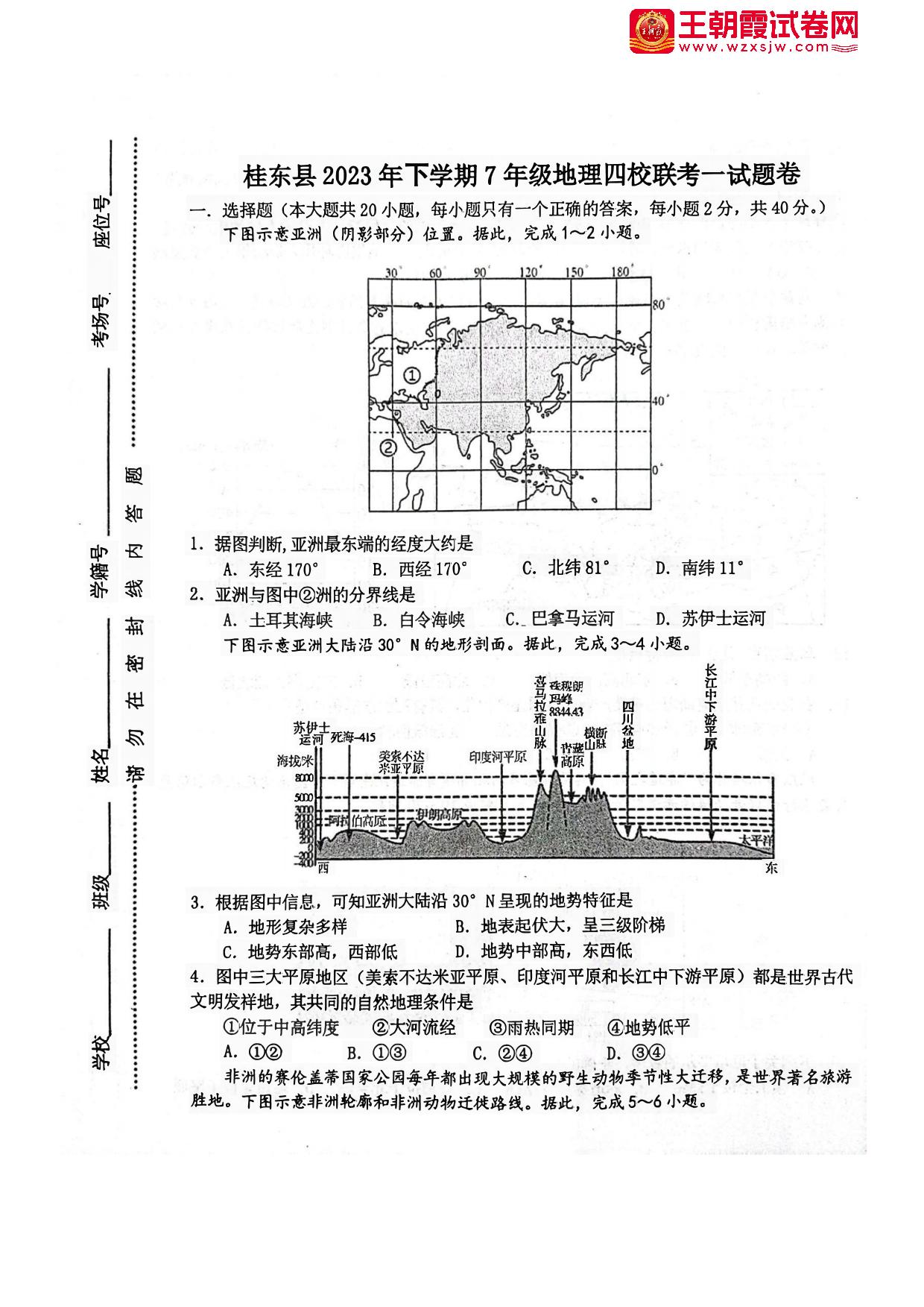 湖南郴州市桂东县四校联考2022-2023学年下学期3月月考试卷七年级地理(湘教版)