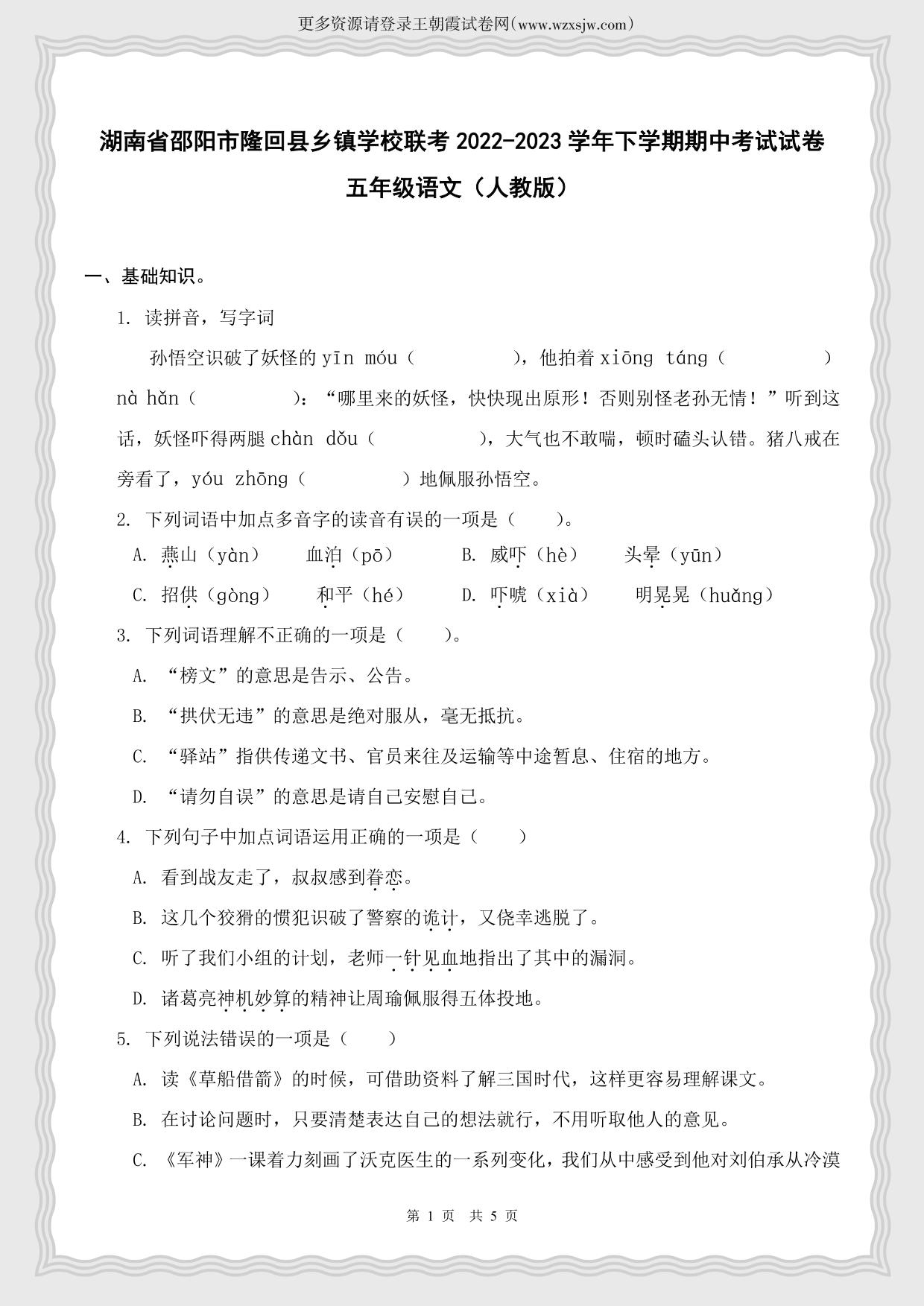 湖南省邵阳市隆回县乡镇学校联考2022-2023学年下学期期中考试试卷五年级语文(人教版)