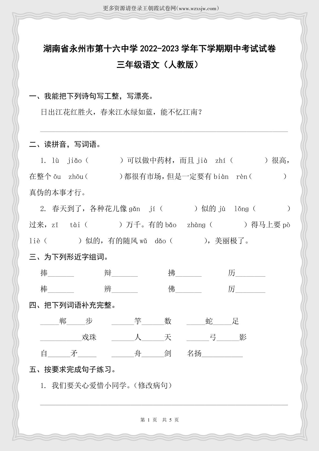 湖南省永州市第十六中学2022-2023学年下学期期中考试试卷三年级语文(人教版)