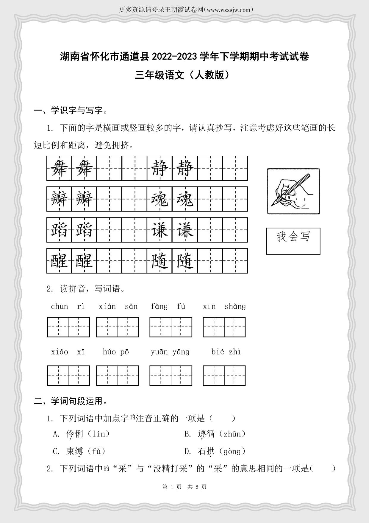 湖南省怀化市通道县2022-2023学年下学期期中考试试卷三年级语文(人教版)