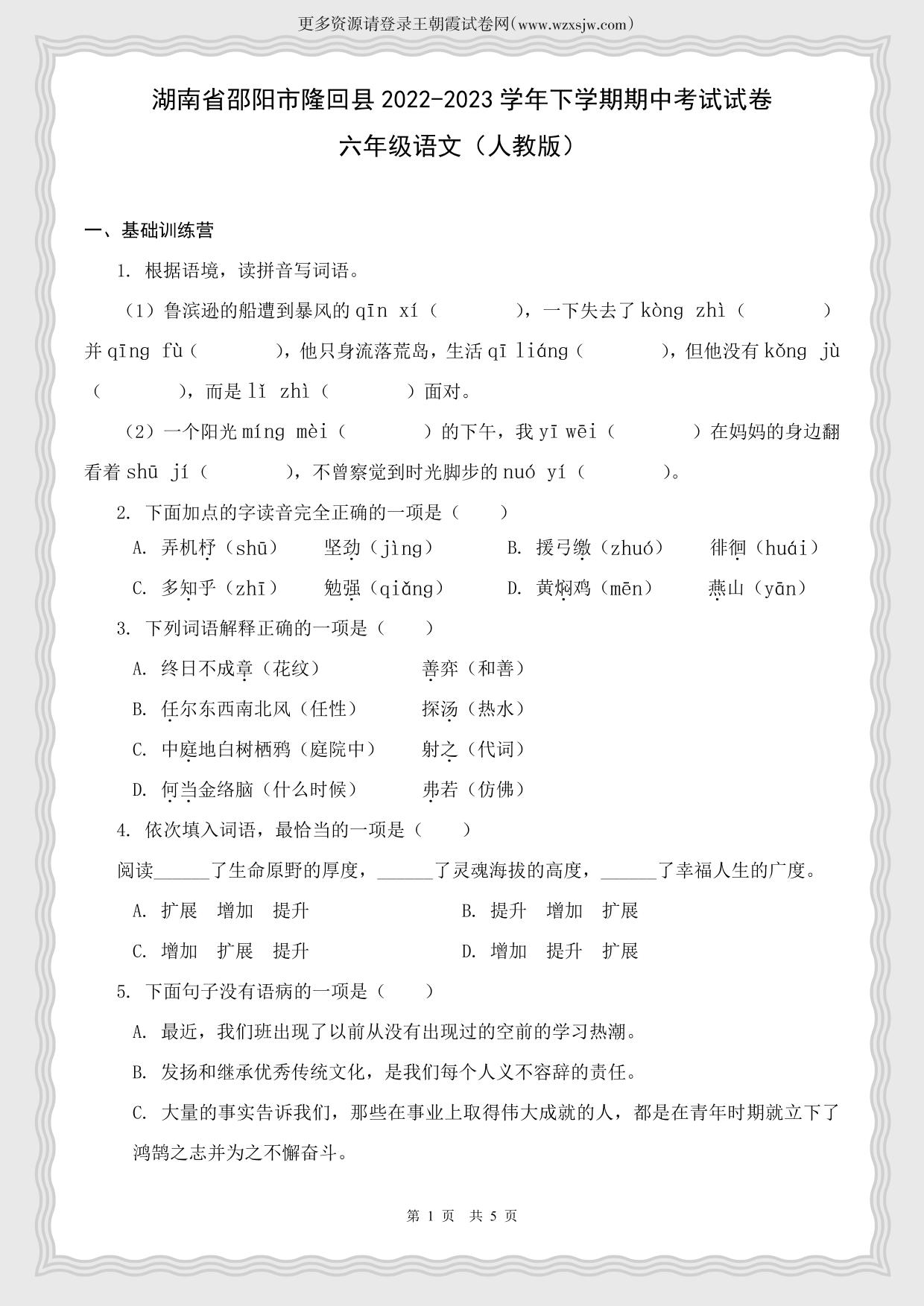 湖南省邵阳市隆回县2022-2023学年下学期期中考试试卷六年级语文(人教版)