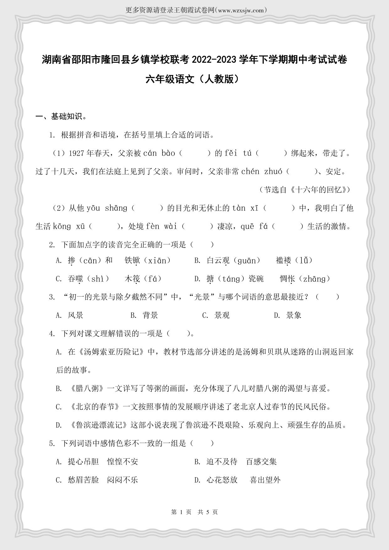 湖南省邵阳市隆回县乡镇学校联考2022-2023学年下学期期中考试试卷六年级语文(人教版)