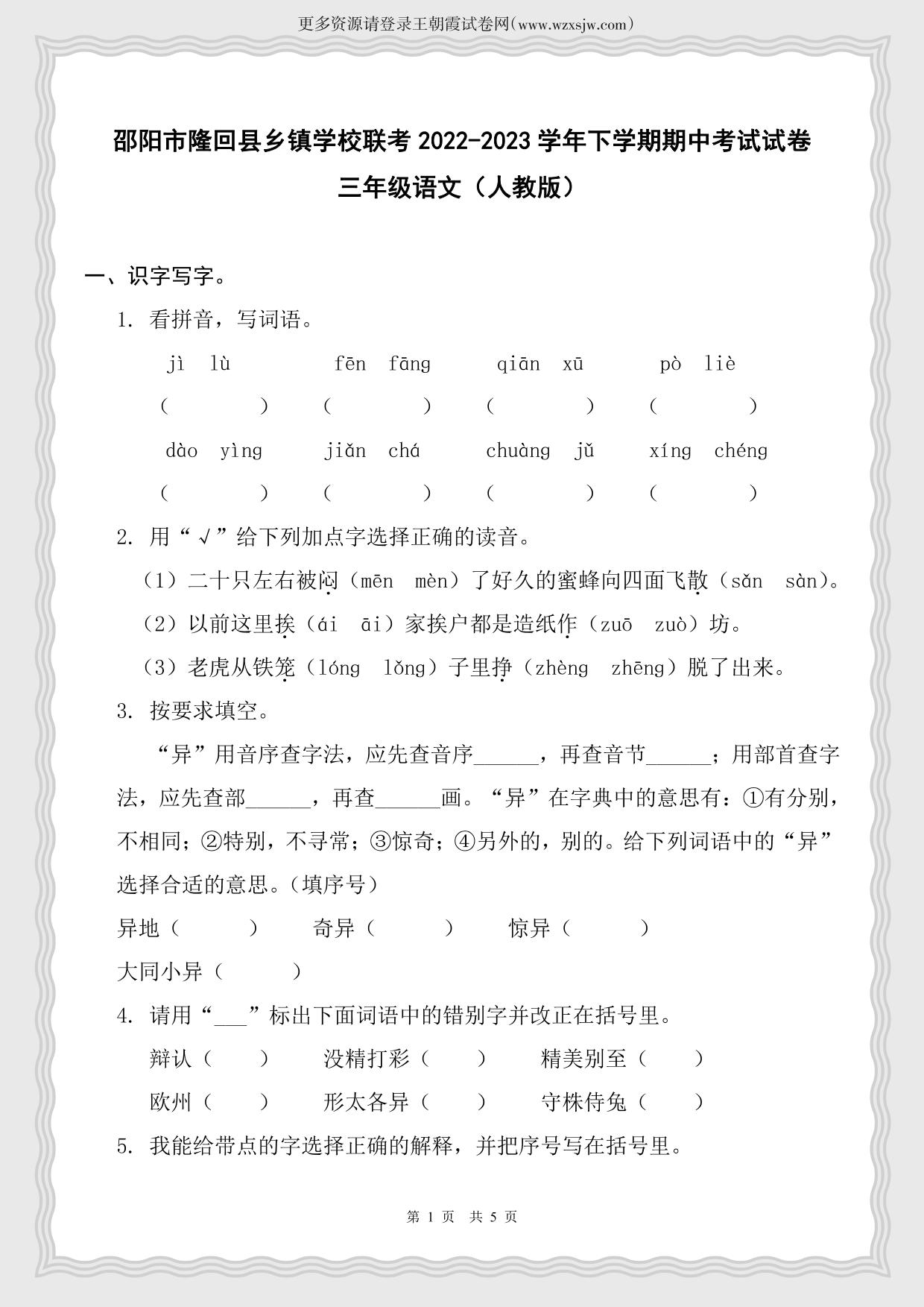 湖南省邵阳市隆回县乡镇学校联考2022-2023学年下学期期中考试试卷三年级语文(人教版)