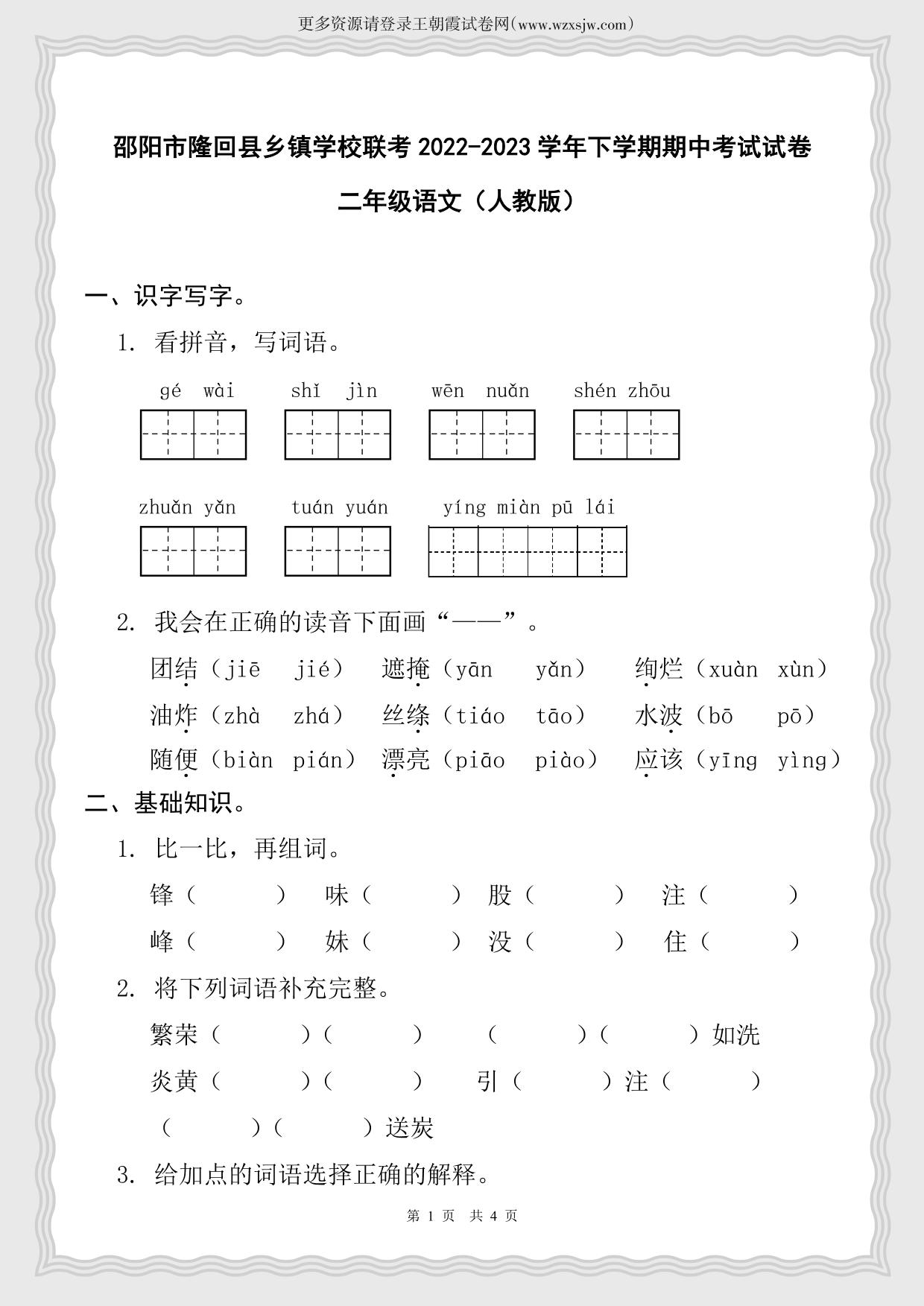湖南省邵阳市隆回县乡镇学校联考2022-2023学年下学期期中考试试卷二年级语文(人教版)