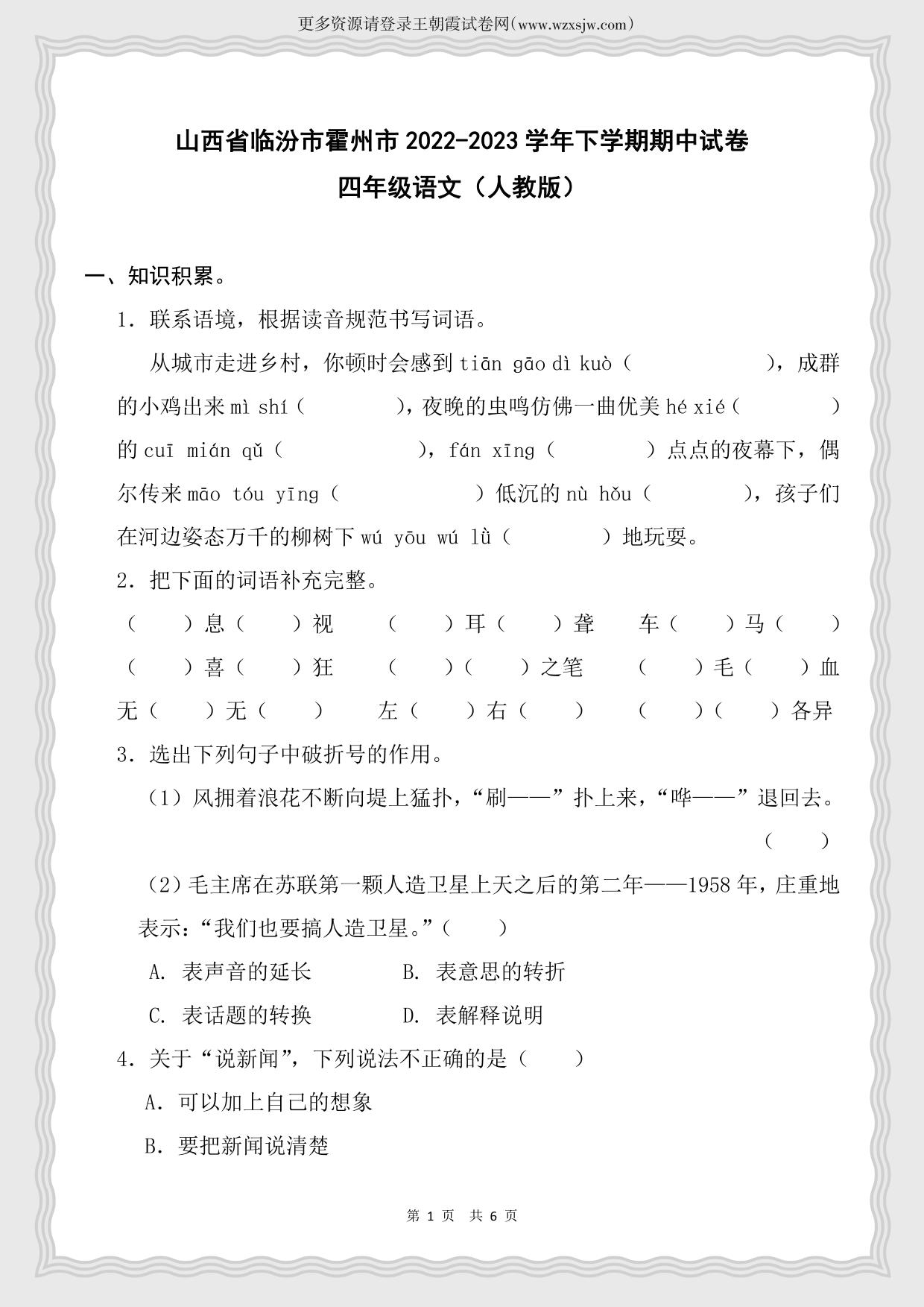 山西省临汾市霍州市2022-2023学年下学期期中试卷四年级语文(人教版)