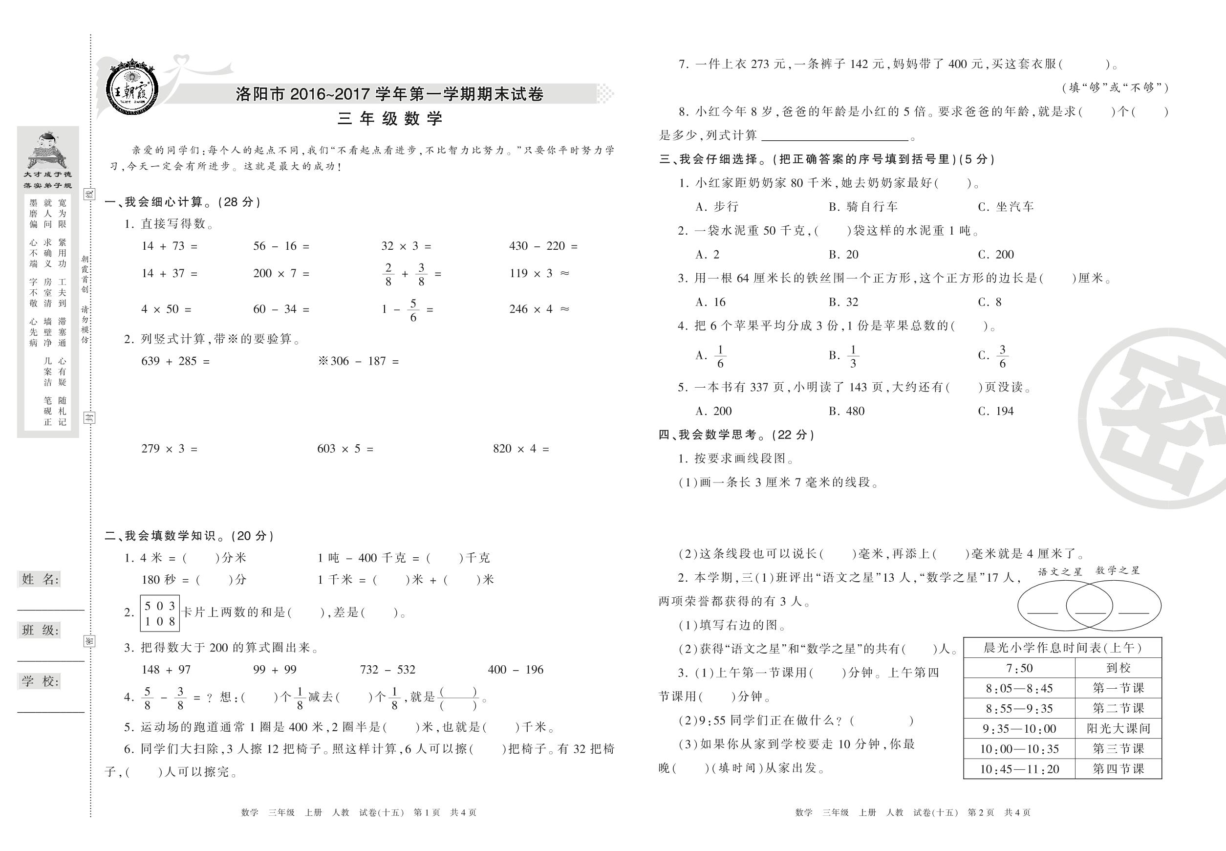 2016-2017学年第一学期洛阳市三年级数学试卷(人教版)【15】