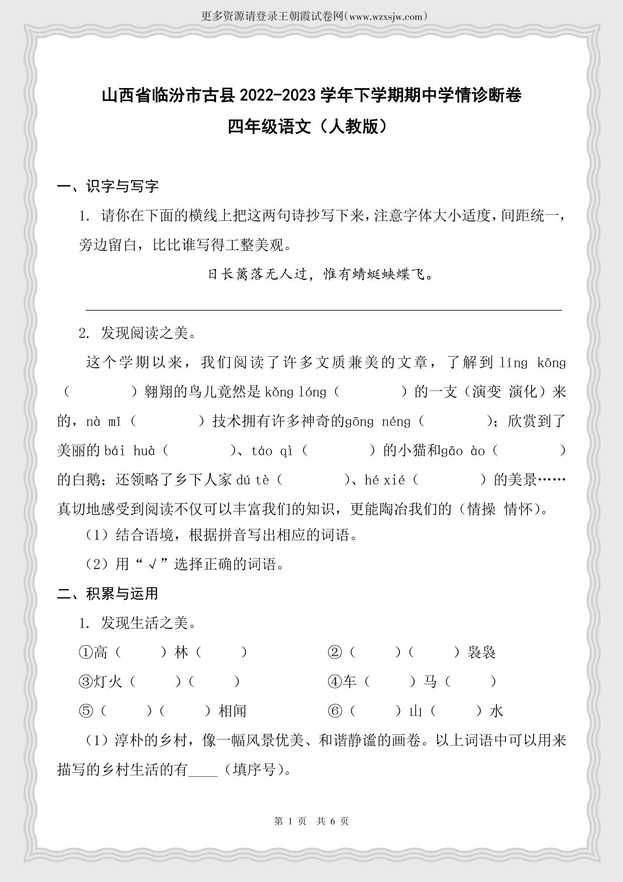 山西省临汾市古县2022-2023学年下学期期中学情诊断卷四年级语文(人教版)