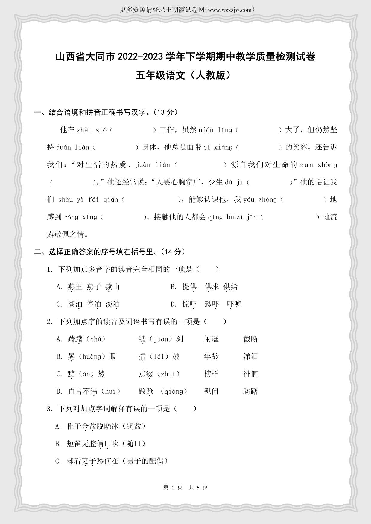 山西省大同市2022-2023学年下学期期中教学质量检测试卷五年级语文(人教版)
