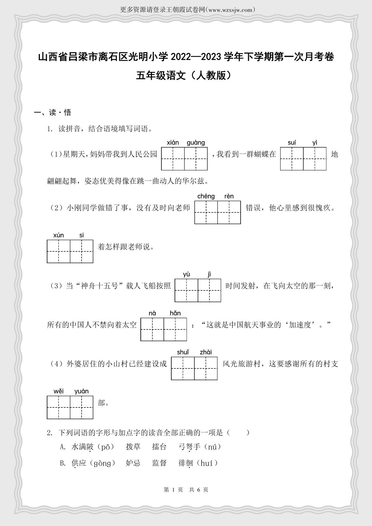 山西省吕梁市离石区光明小学2022—2023学年下学期第一次月考卷五年级语文(人教版)