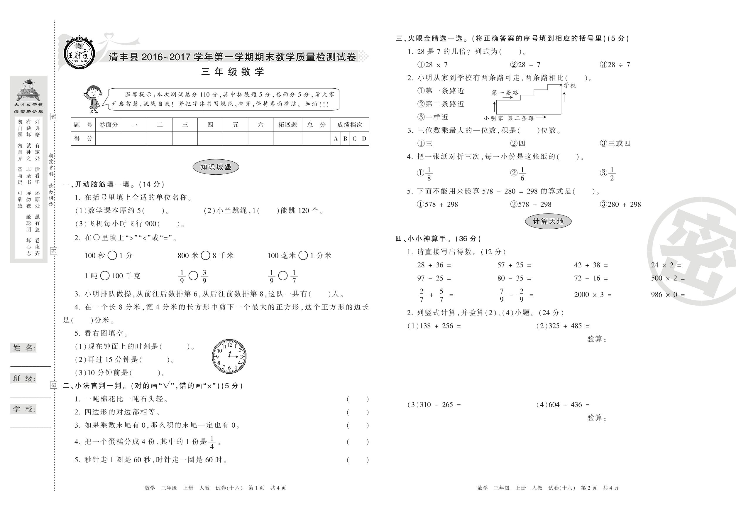 2016-2017学年第一学期濮阳市清丰县三年级数学试卷(人教版)【16】