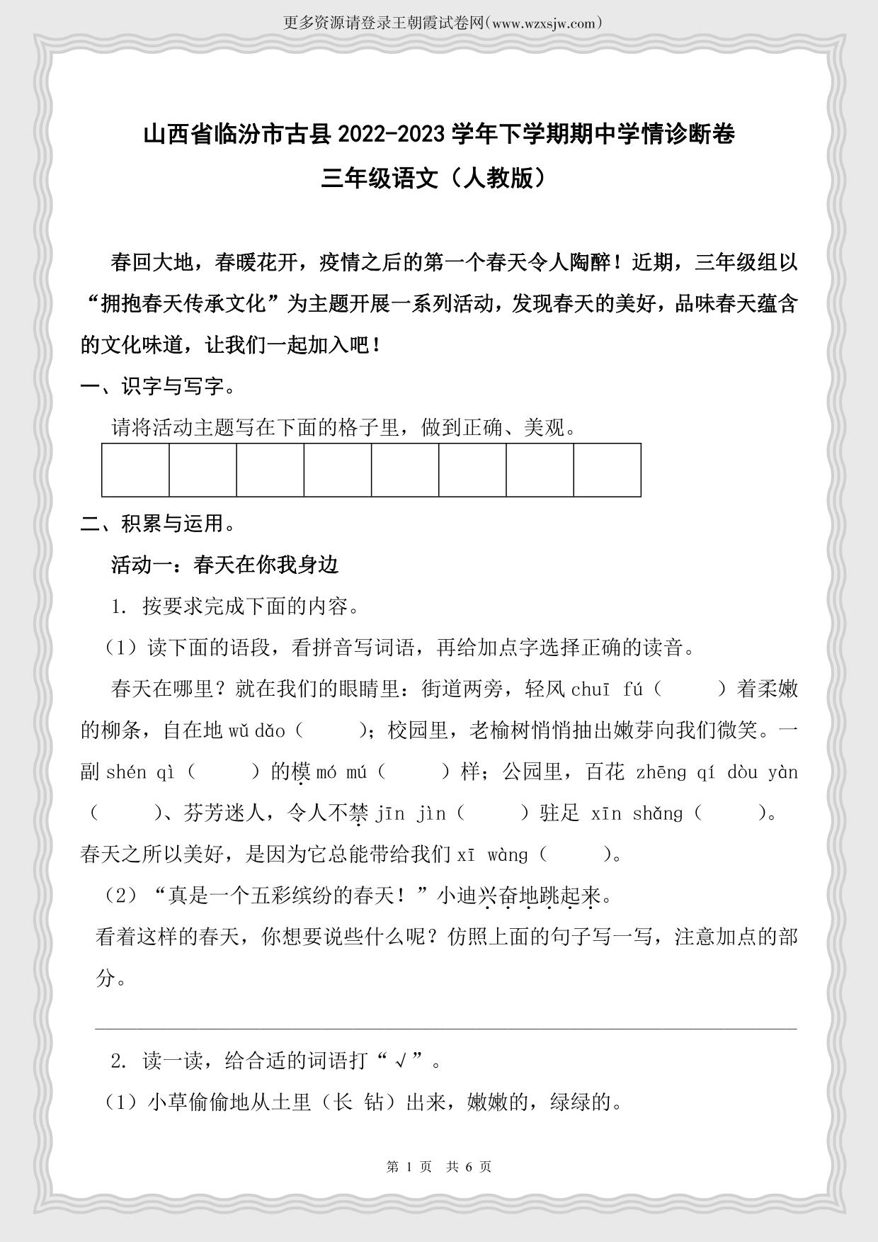 山西省临汾市古县2022-2023学年下学期期中学情诊断卷三年级语文(人教版)