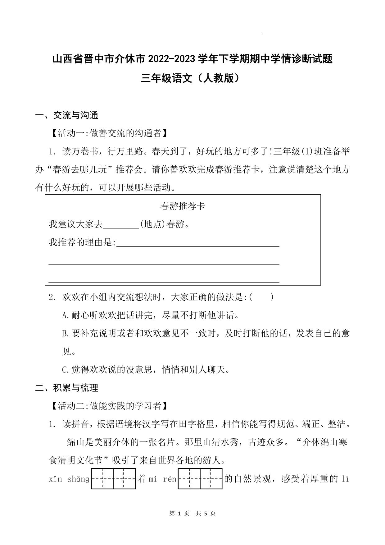 山西省晋中市介休市2022-2023学年下学期期中学情诊断试题三年级语文(人教版)
