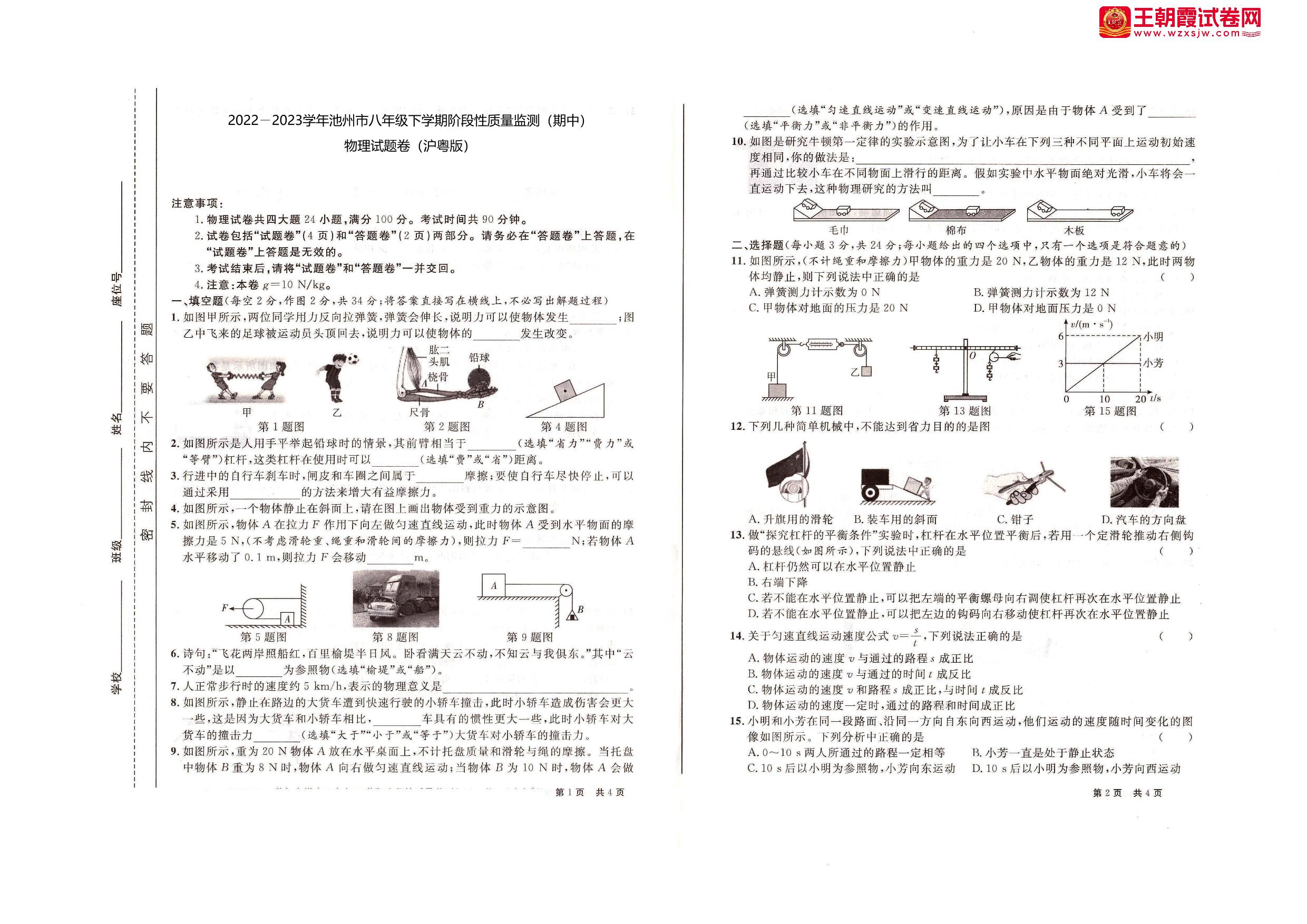 安徽省池州市2002-2023学年下学期阶段性质量监测(期中)八年级物理(沪粤版)
