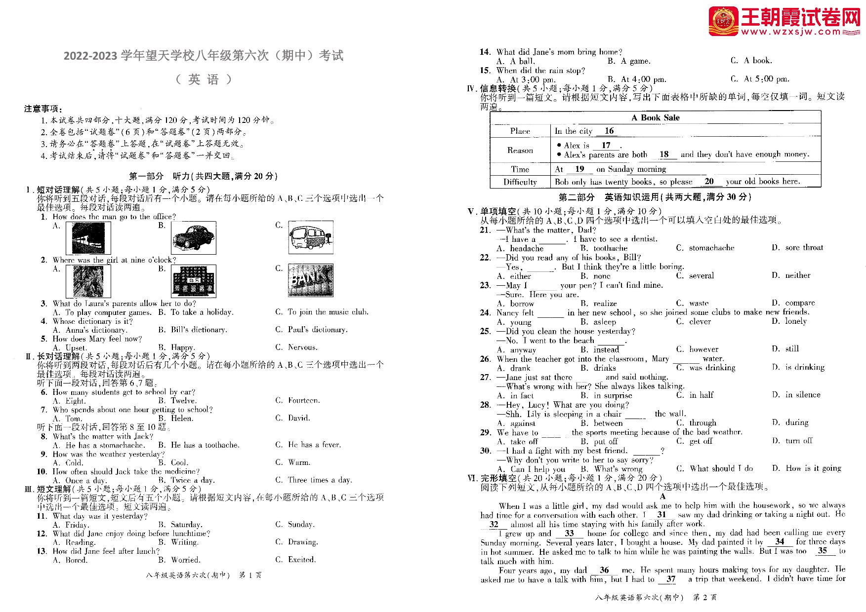 安徽省安庆市太湖县望天学校2022-2023学年下学期期中考试八年级英语(人教版)