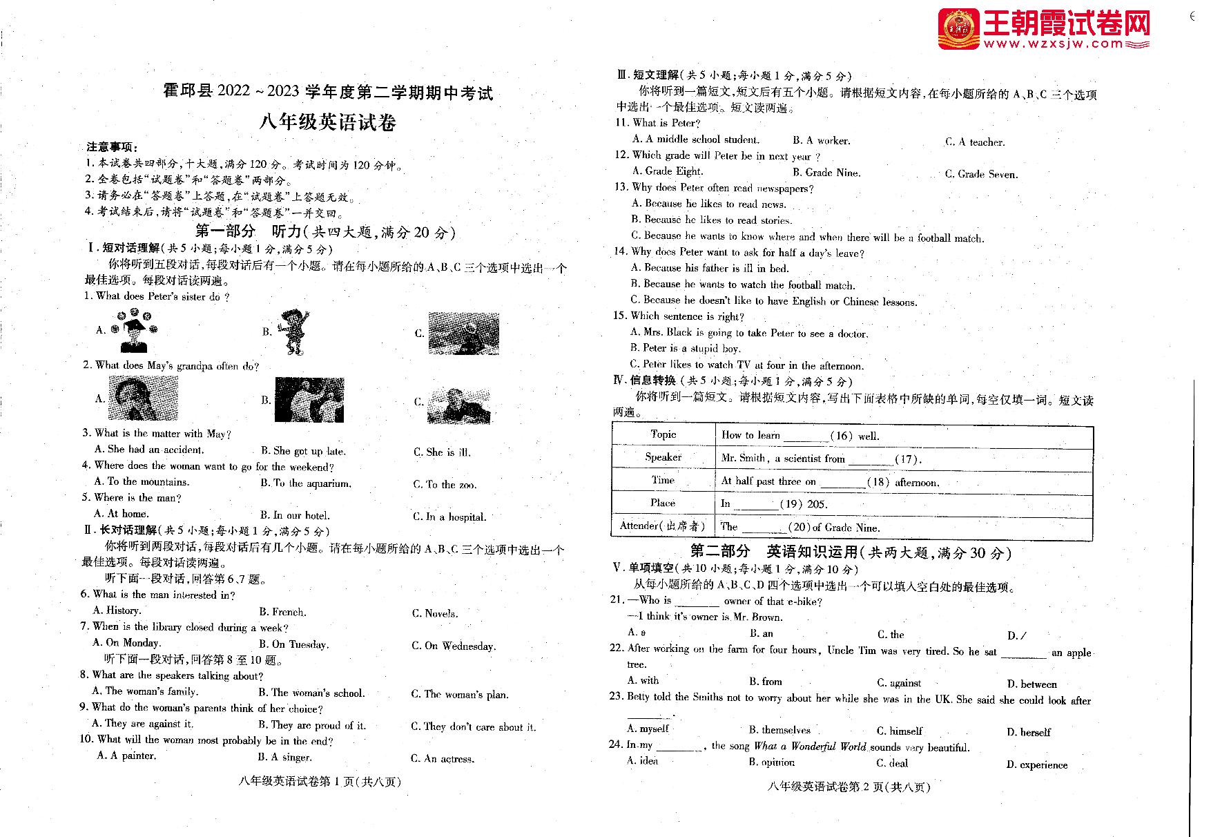 安徽省六安市霍邱县2022-2023学年度第二学期期中考试八年级英语(人教版)
