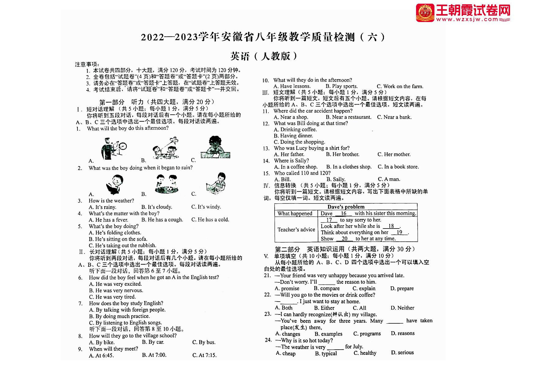 安徽省芜湖市部分学校2022-2023学年第二学期期中教学质量检测八年级英语(人教版)【无听力音频】