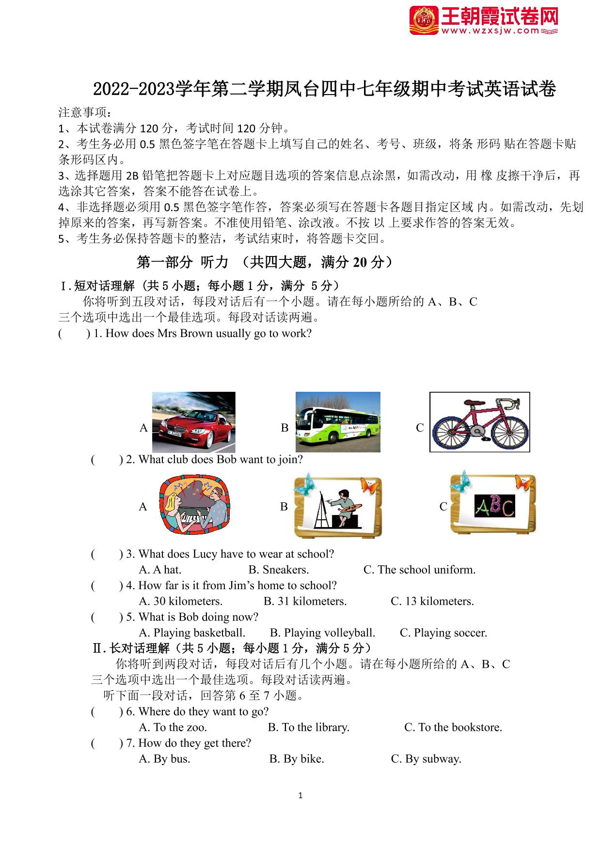 安徽省淮南市凤台县第四中学2022-2023学年下学期期中考试七年级英语(人教版)【无听力音频】