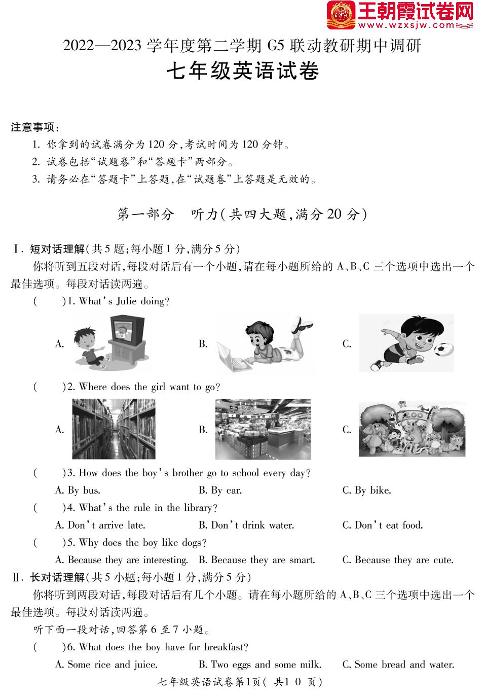 安徽省蚌埠市第一实验学校2022-2023学年度第二学期G5联动教研期中调研七年级英语(人教版)【无听力音频】