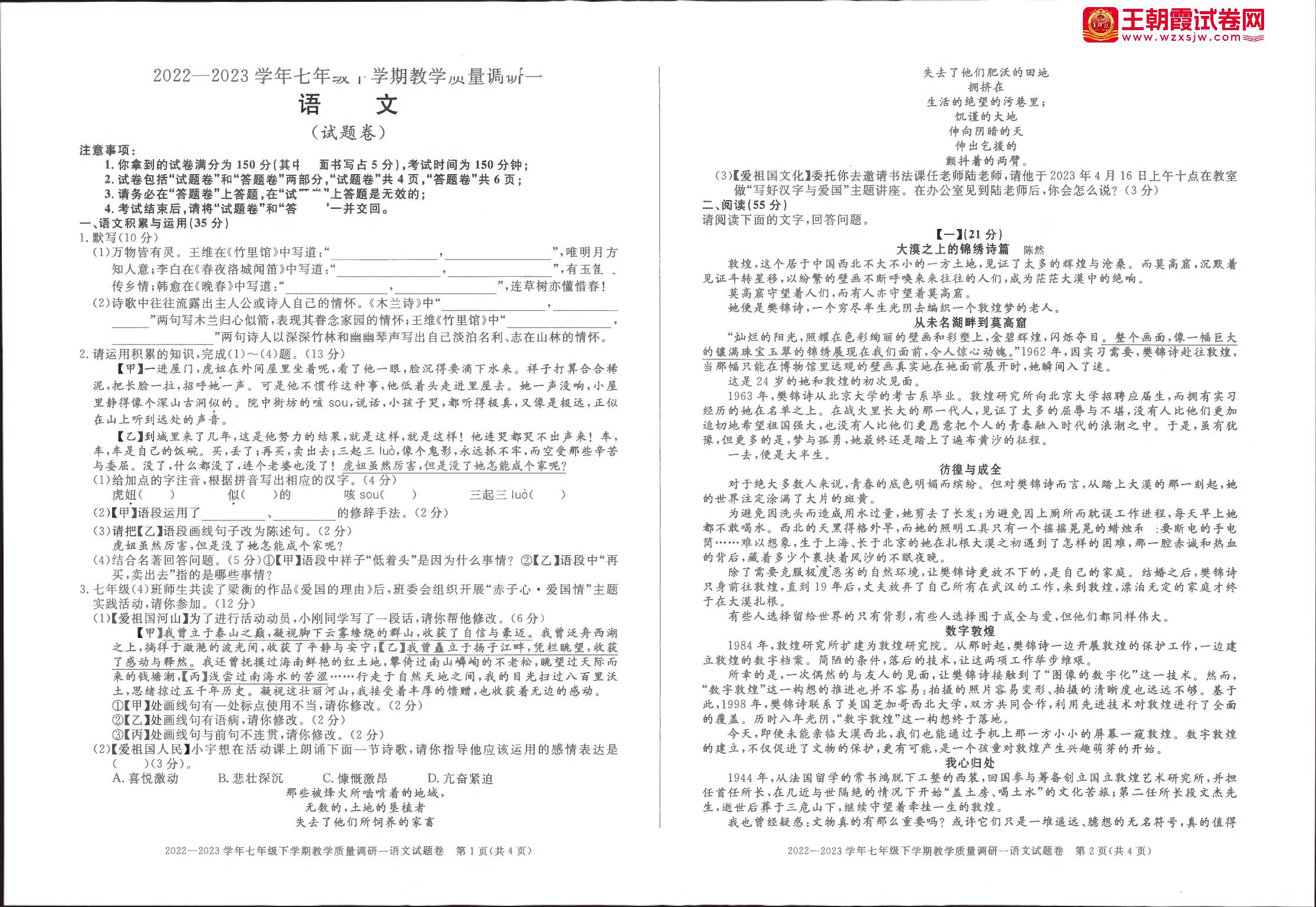 安徽省蚌埠市蚌山区2022-2023学年下学期3月月考七年级语文(人教版)
