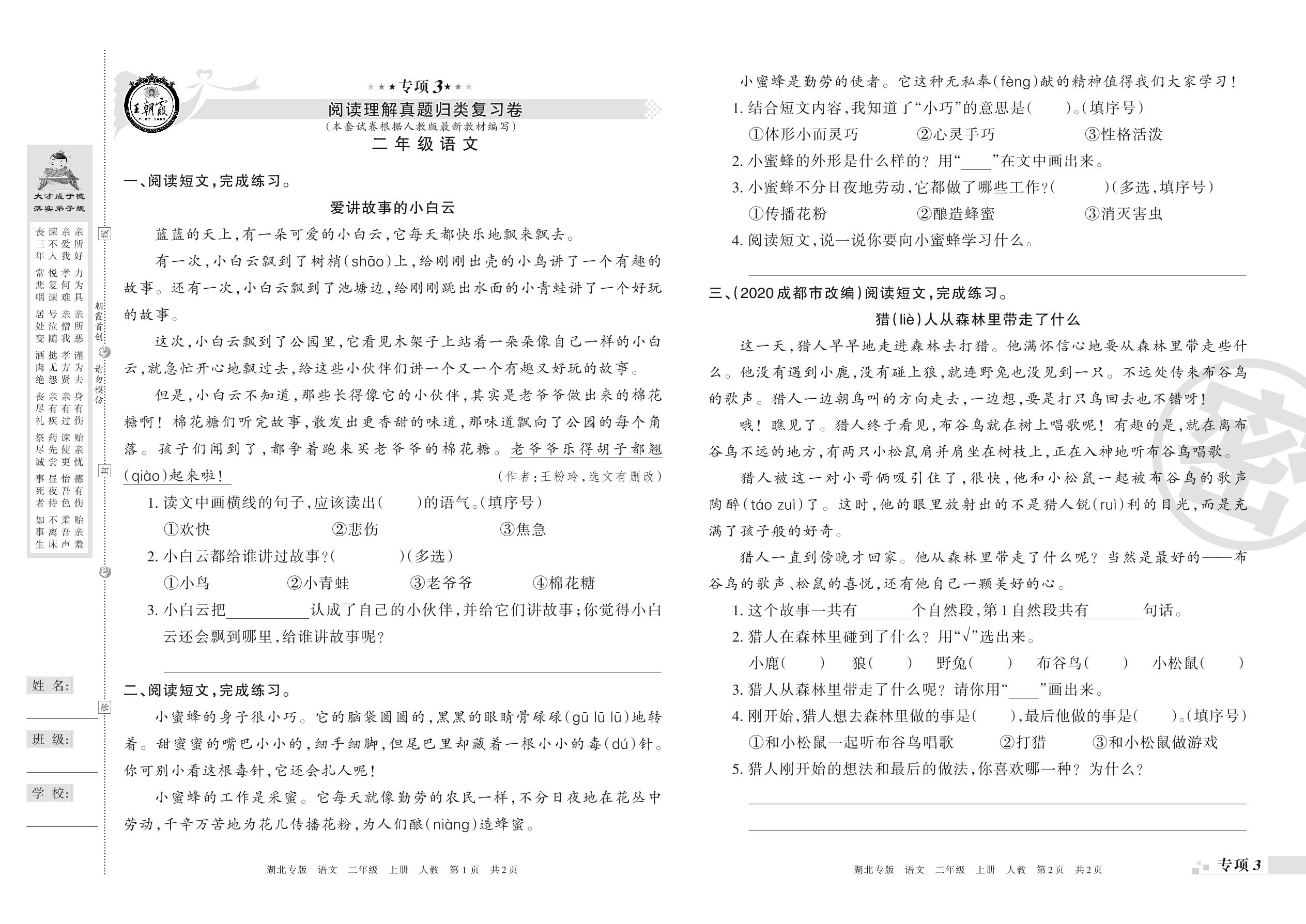 王朝霞期末专项卷——阅读理解、写话真题归类复习二年级上册语文(人教版)_R21080165005【0】