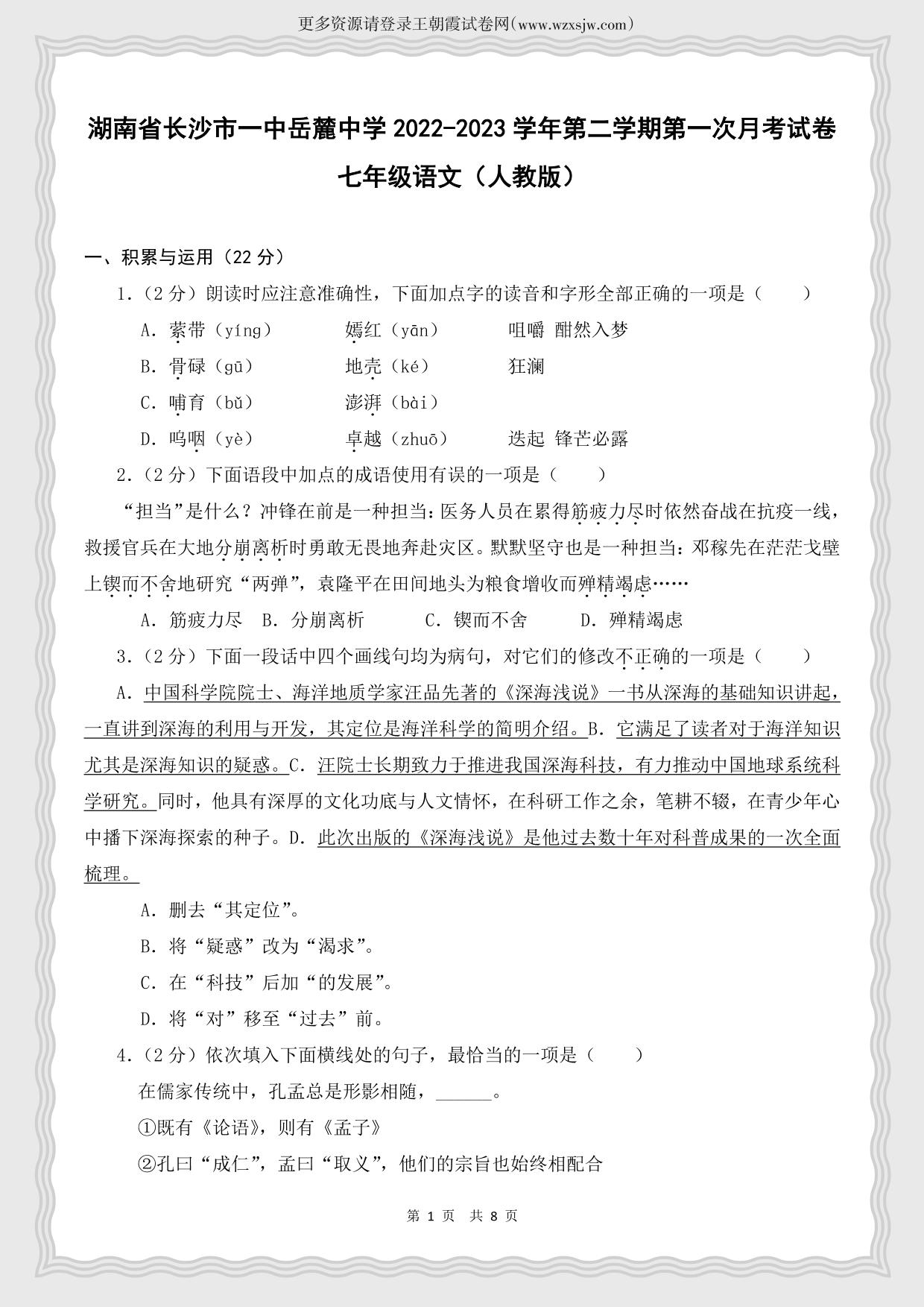 湖南省长沙市一中岳麓中学2022-2023学年第二学期第一次月考试卷七年级语文(人教版)