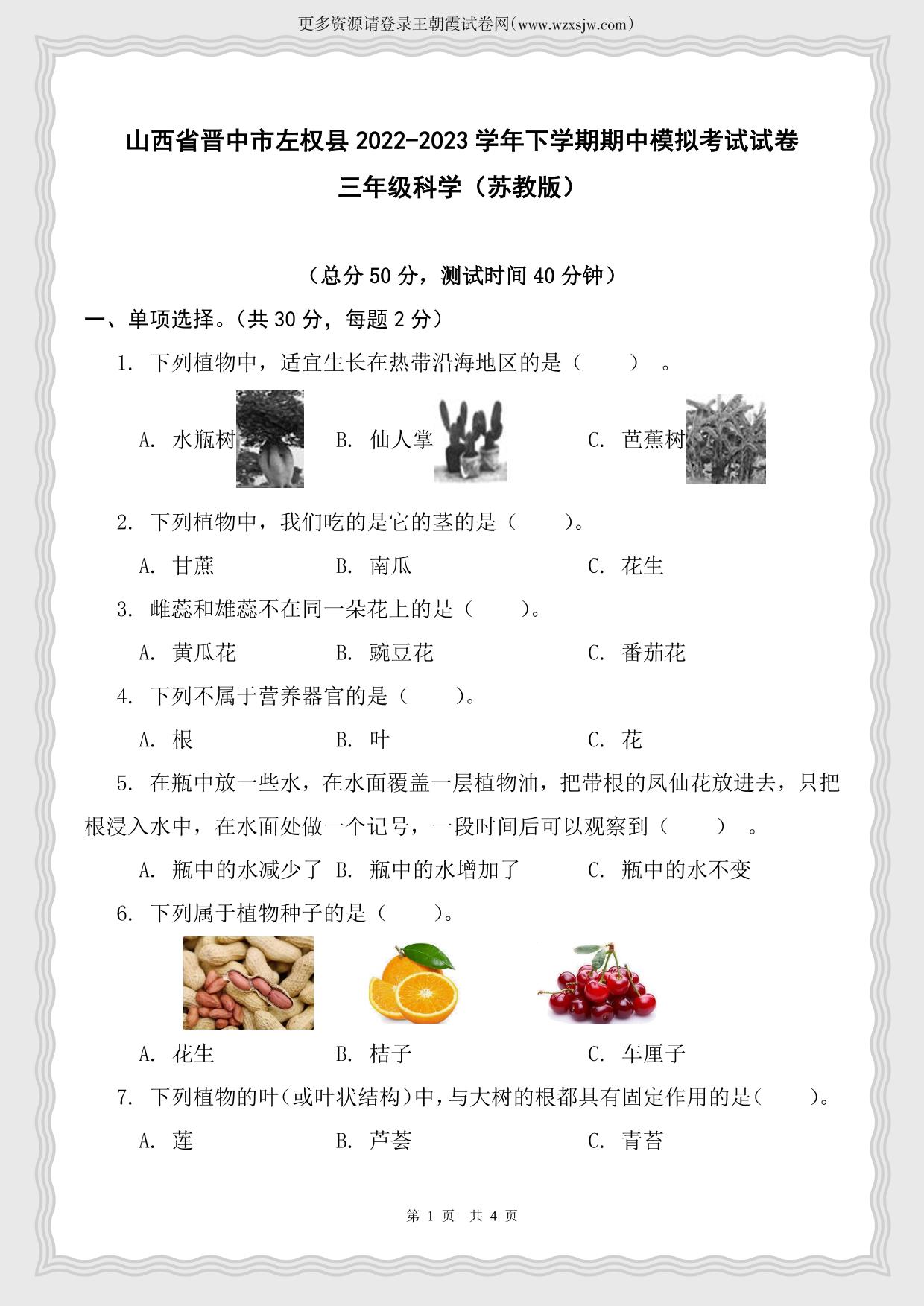 山西省晋中市左权县2022-2023学年下学期期中模拟考试试卷三年级科学(苏教版)