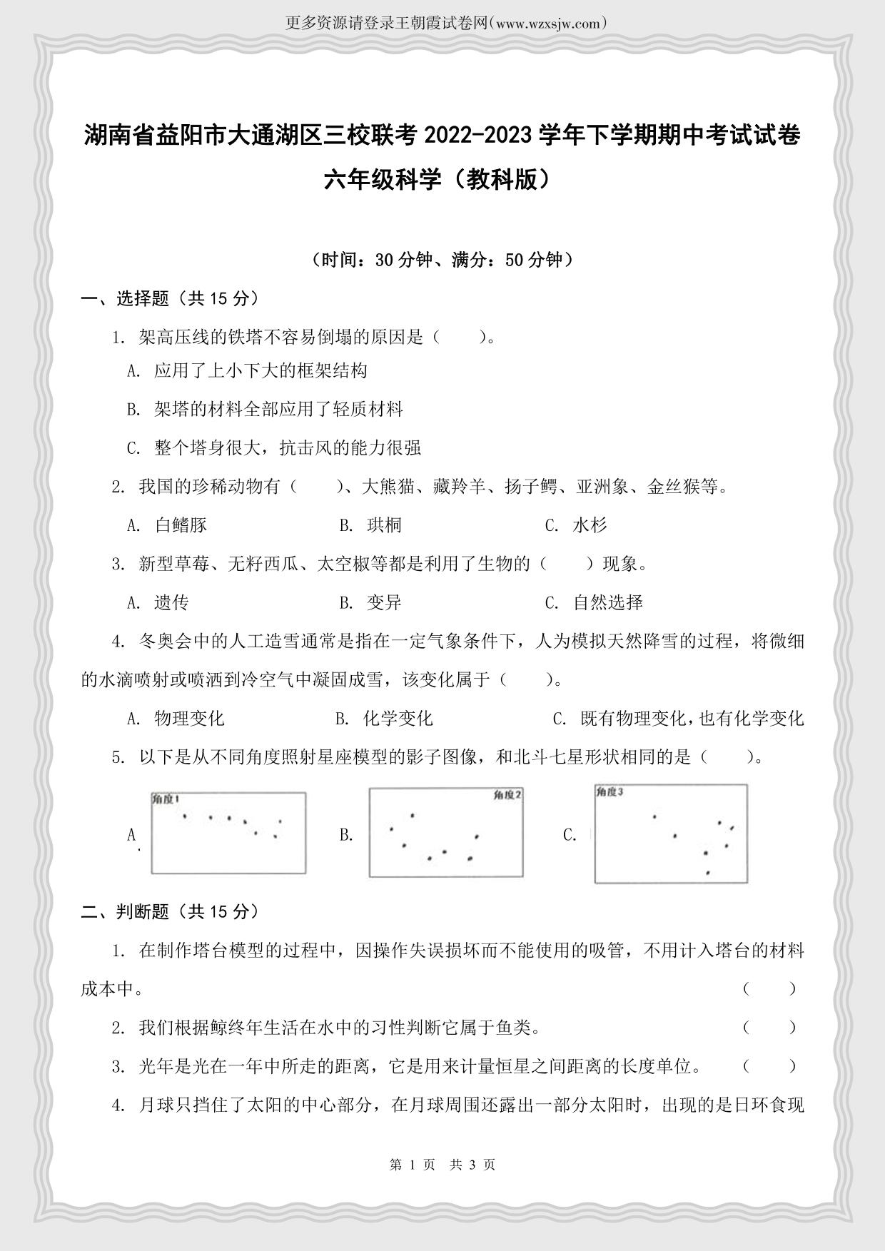 湖南省益阳市大通湖区三校联考2022-2023学年下学期期中考试试卷六年级科学(教科版)