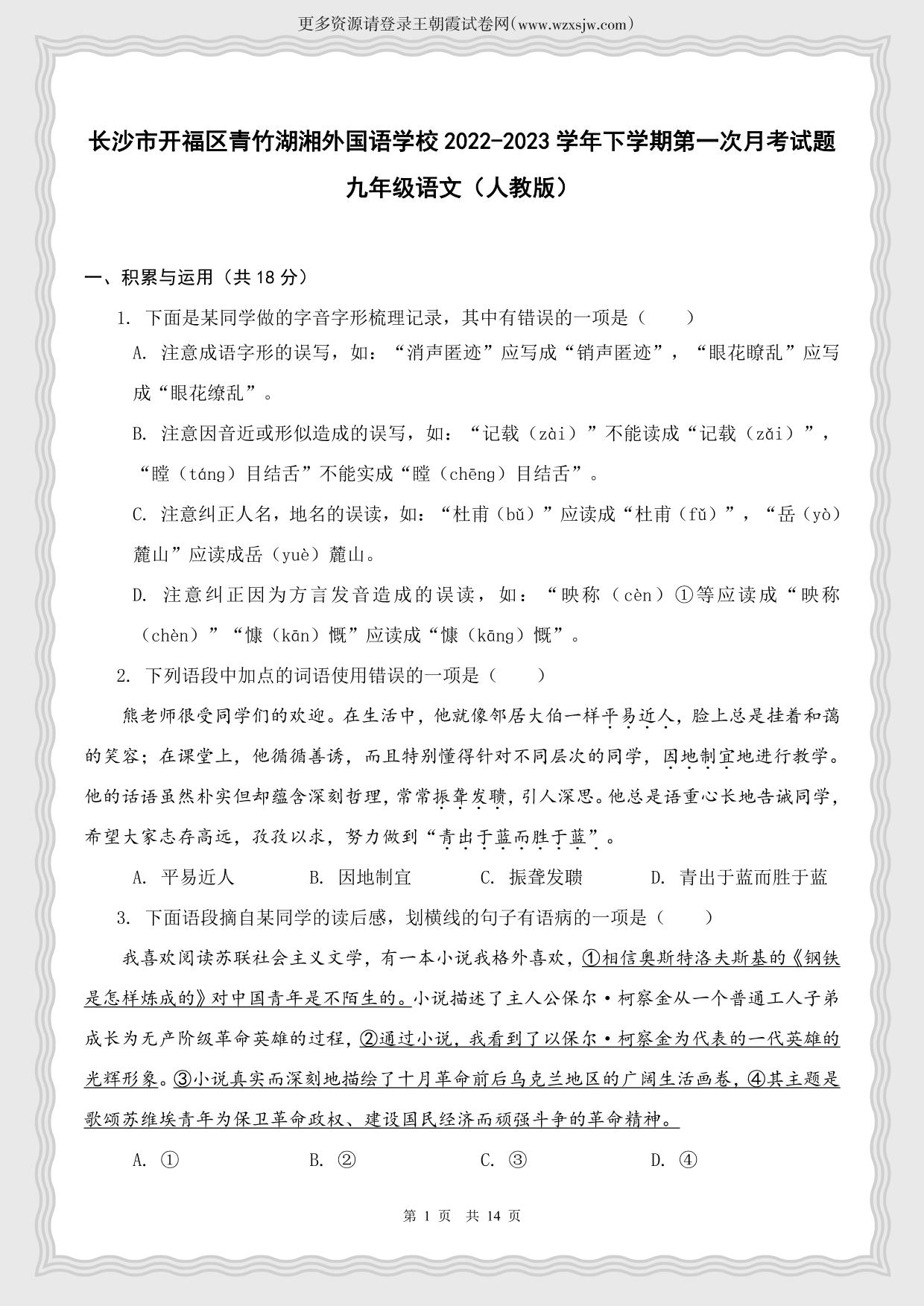 湖南省长沙市开福区青竹湖湘一外国语学校2022-2023学年下学期第一次月考试题九年级语文(人教版)