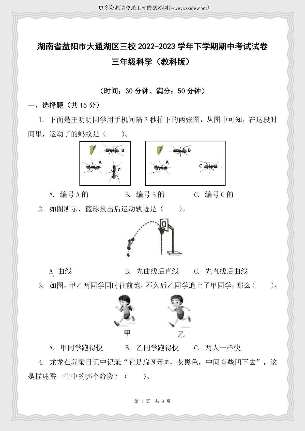 湖南省益阳市大通湖区三校联考2022-2023学年下学期期中考试试卷三年级科学(教科版)