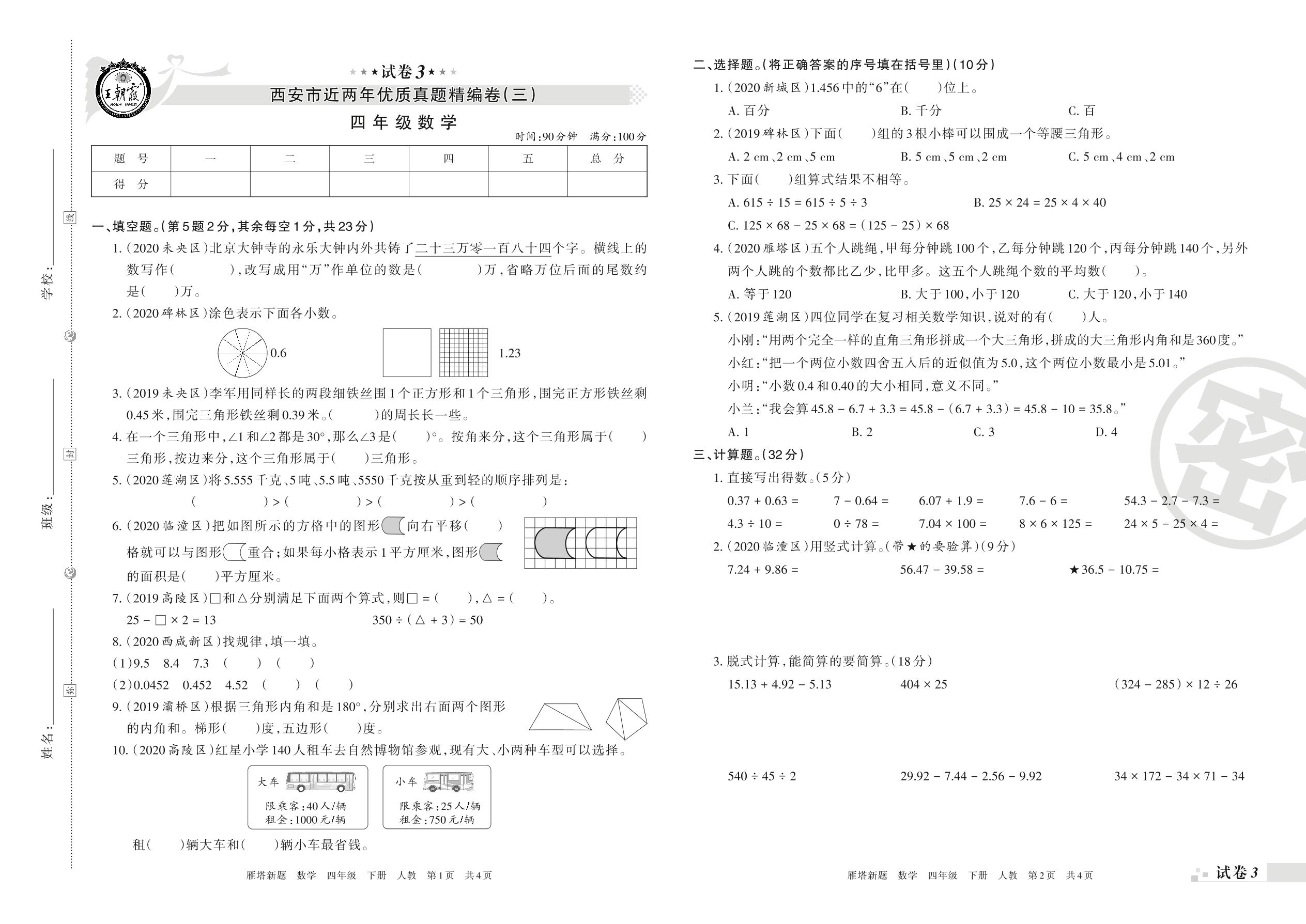 西安市近两年优质试题精编卷(三)四年级下册数学(人教版)【3】