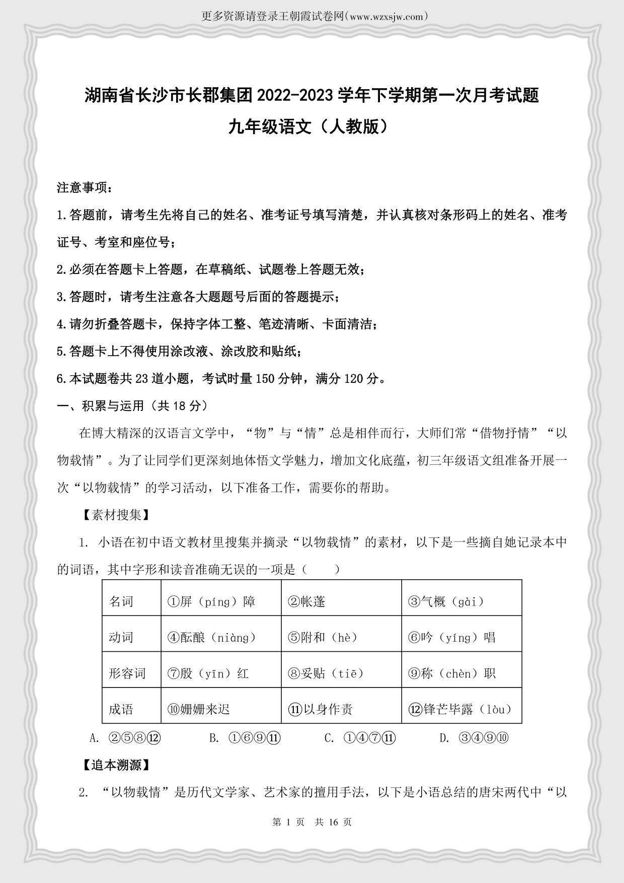 湖南省长沙市长郡集团2022-2023学年下学期第一次月考试题九年级语文(人教版)