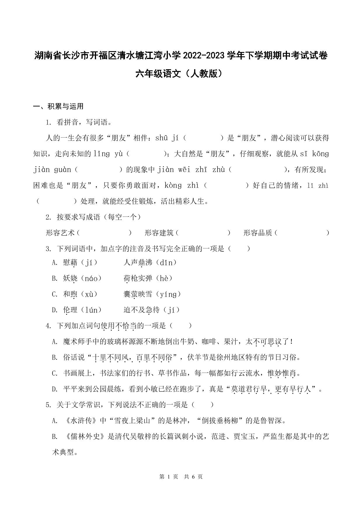 湖南省长沙市开福区清水塘江湾小学2022-2023学年下学期期中考试试卷六年级语文(人教版)