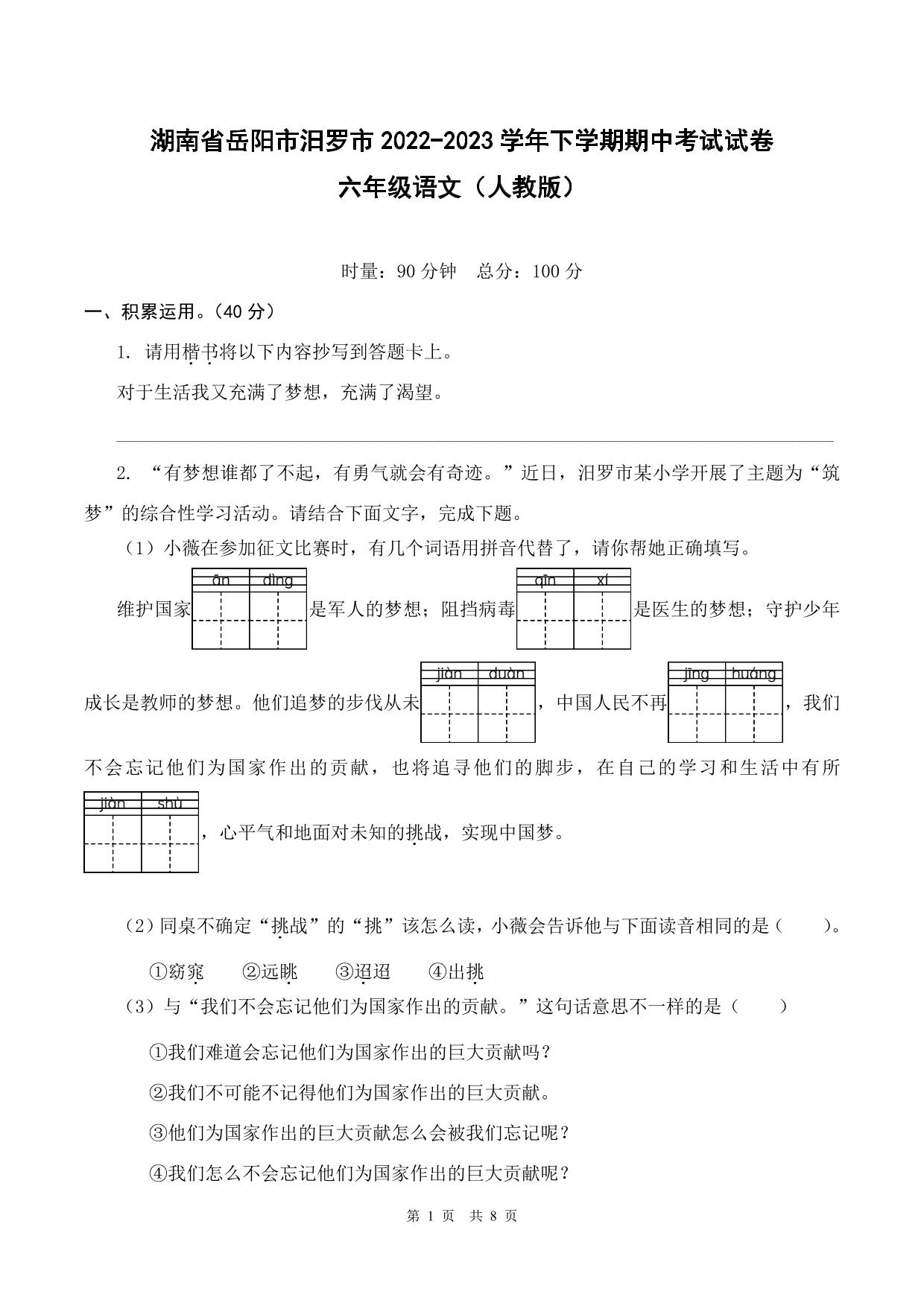 湖南省岳阳市汨罗市2022-2023学年下学期期中考试试卷六年级语文(人教版)