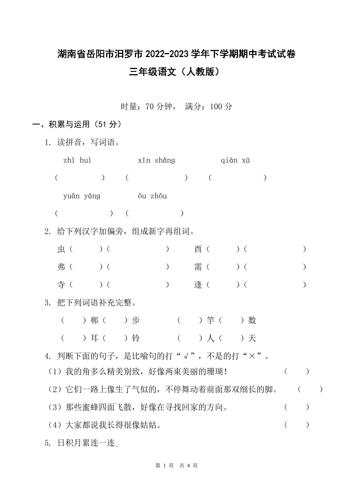 湖南省岳阳市汨罗市2022-2023学年下学期期中考试试卷三年级语文(人教版)