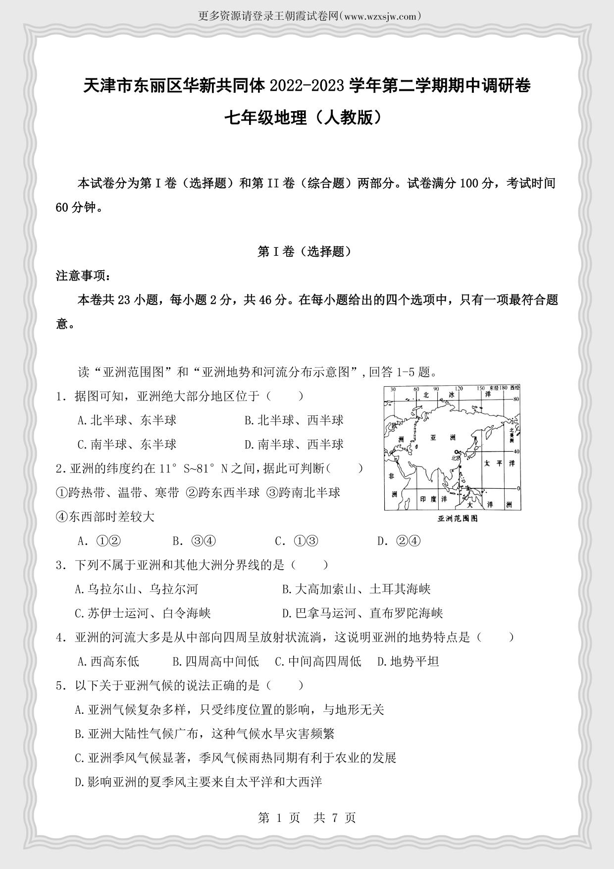 天津市东丽区华新共同体2022-2023学年第二学期期中调研卷七年级地理(人教版)