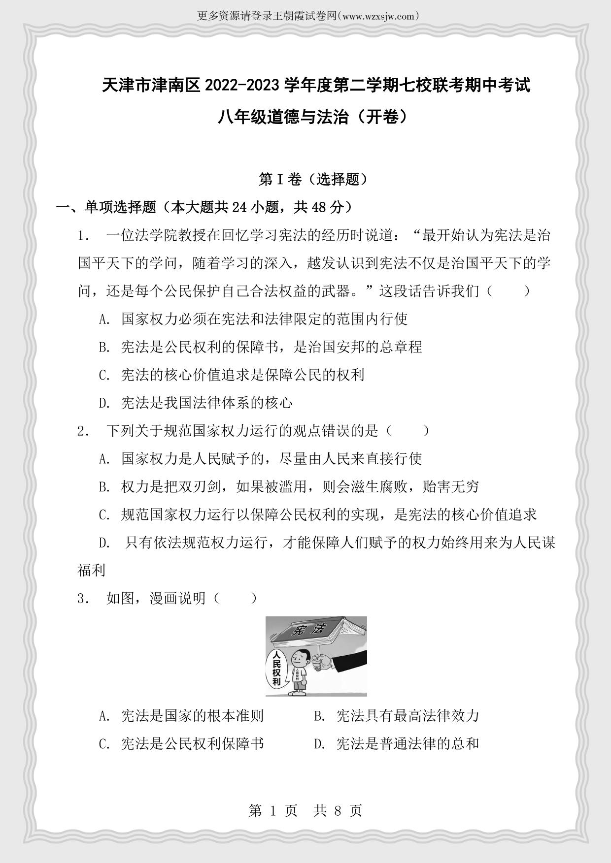 天津市津南区2022-2023学年度第二学期七校联考期中考试八年级道德与法治(人教版)