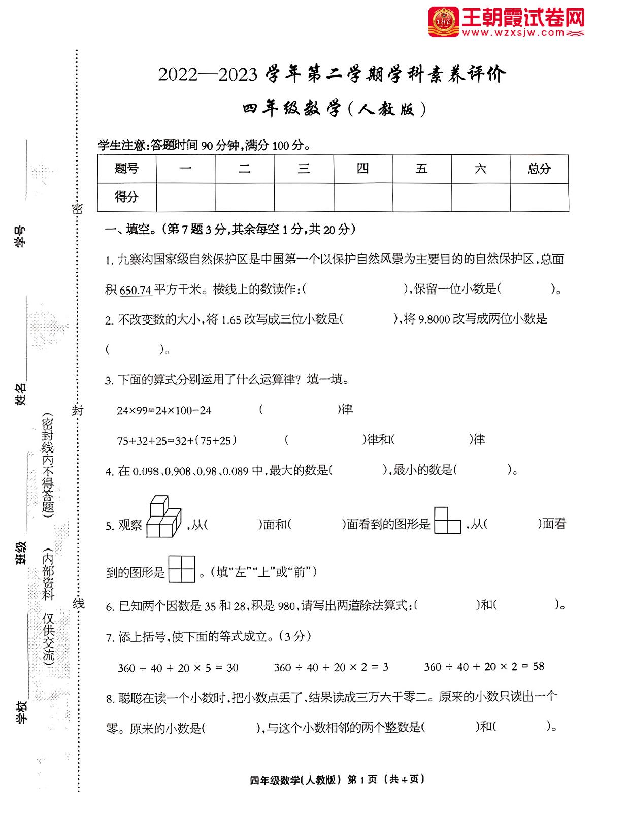 河北省保定市阜平县2022-2023学年第二学期期中学科素养评价四年级数学(人教版)