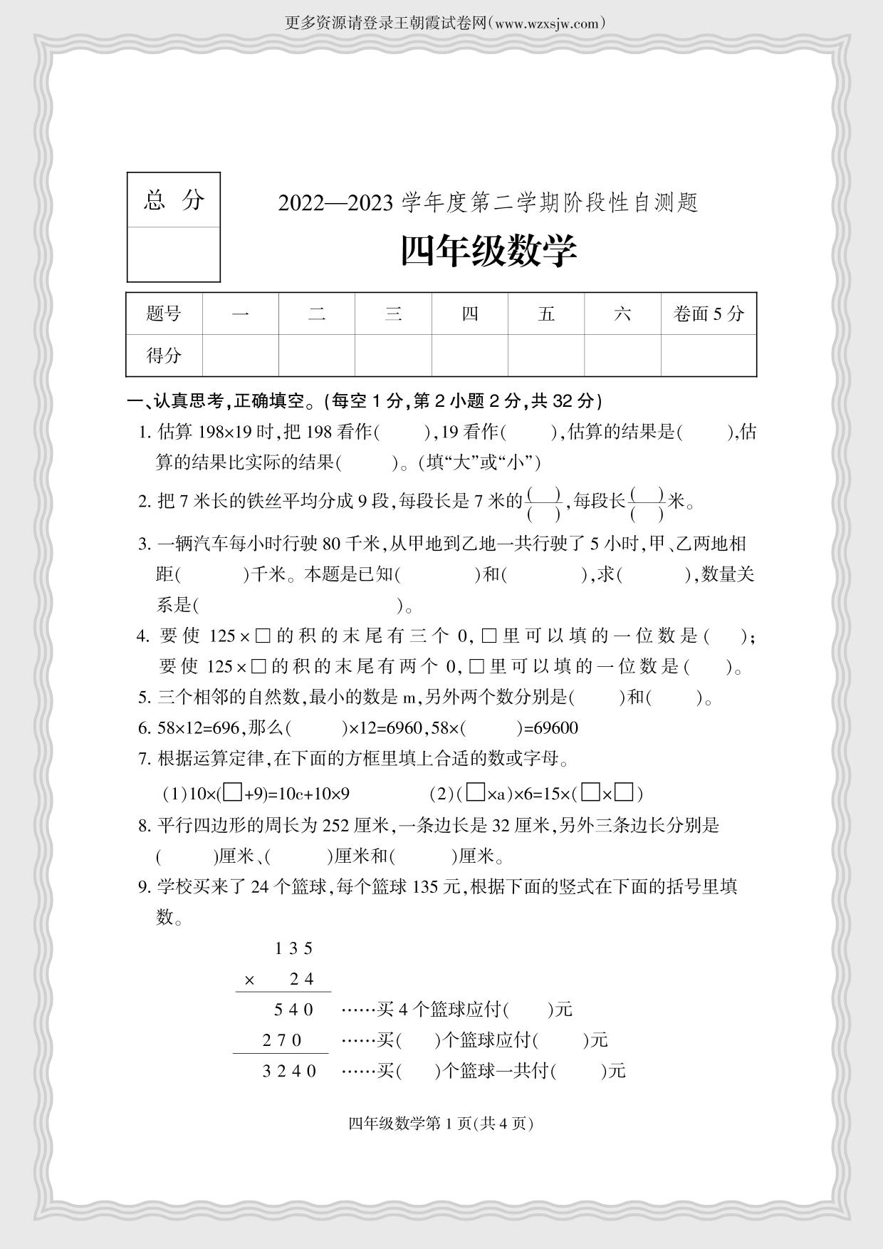 河北省保定市定州市2022-2023学年度第二学期阶段性自测期中试题四年级数学(冀教版)