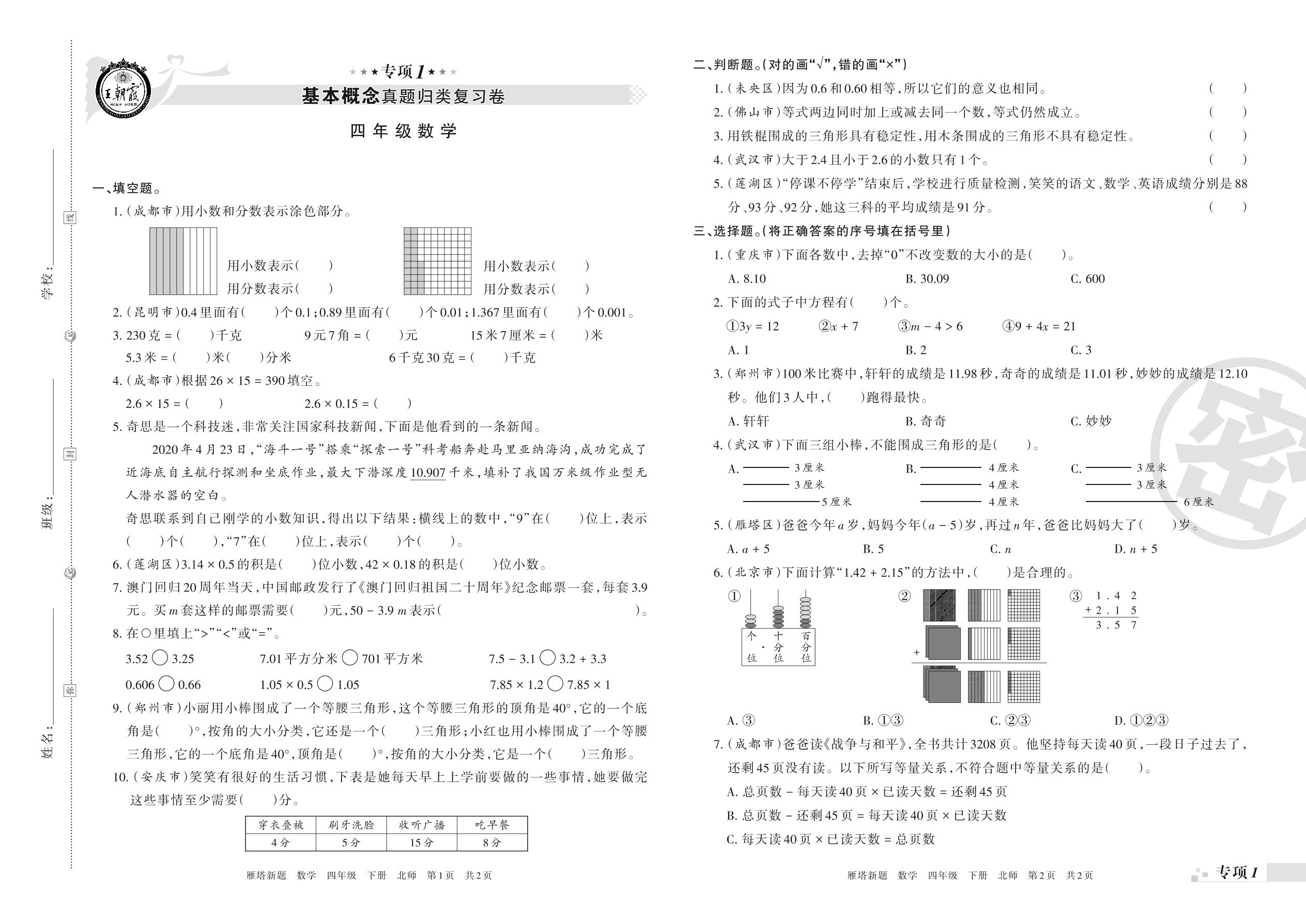 王朝霞期末专项卷——基本概念、计算真题归类复习四年级下册数学(北师版)_R210804133816【0】