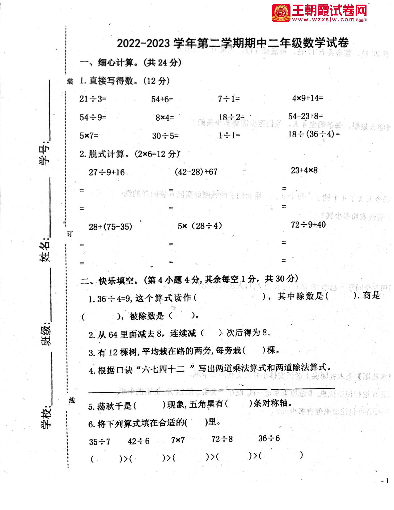 二年级数学人教版下册期中卷