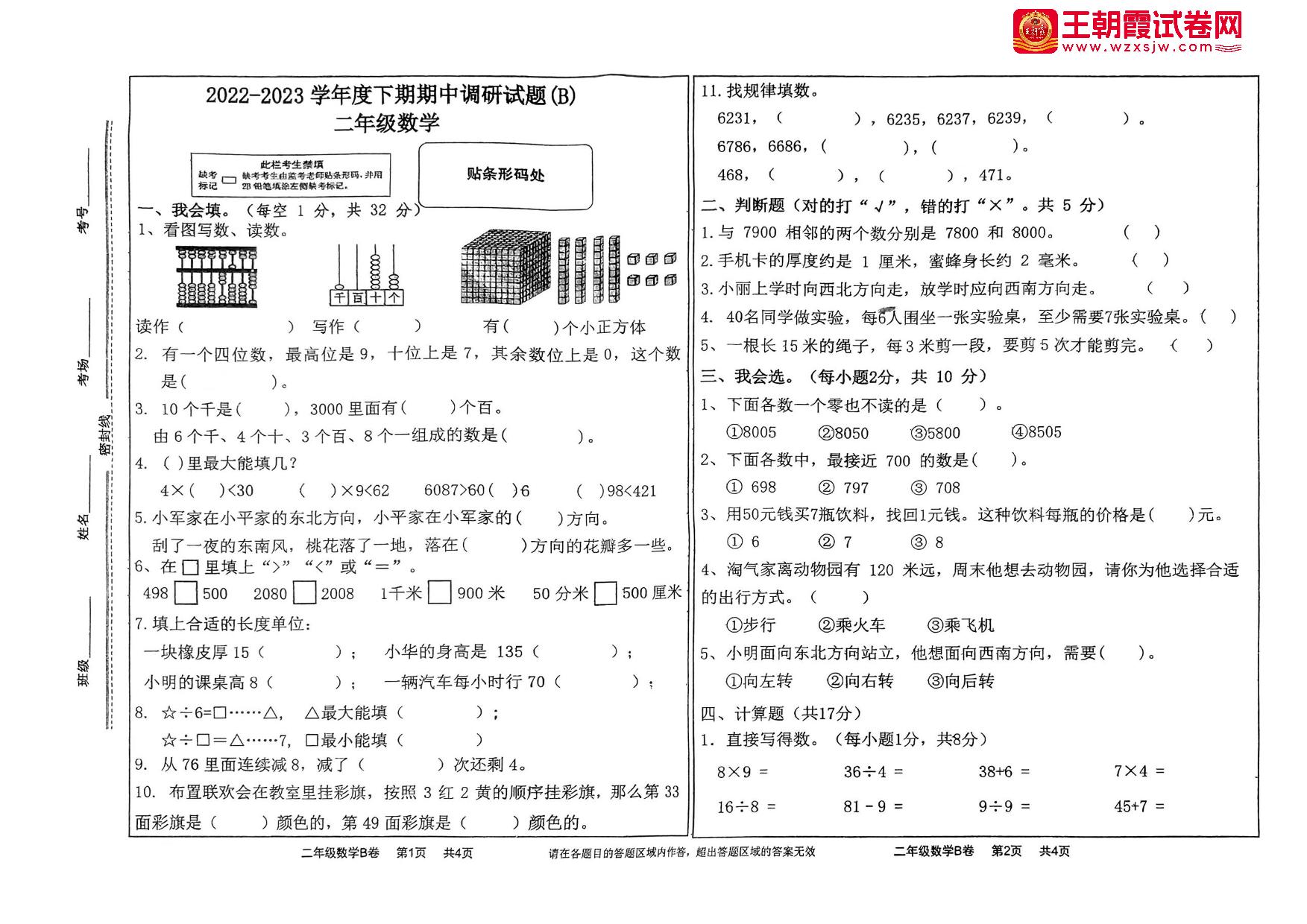 二年级数学人教版下册期中卷