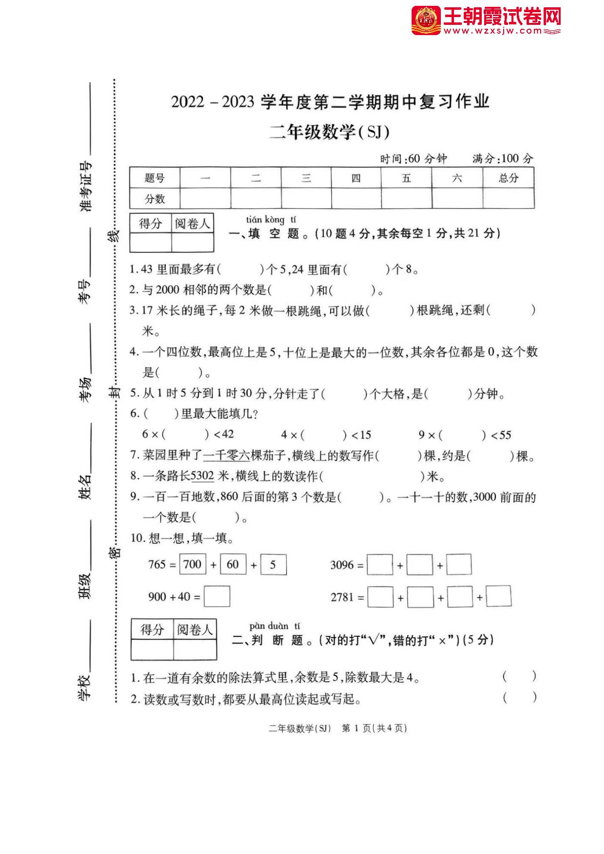 河南省开封市龙亭区县街小学2022—2023学年下学期期中试题二年级数学(苏教版)