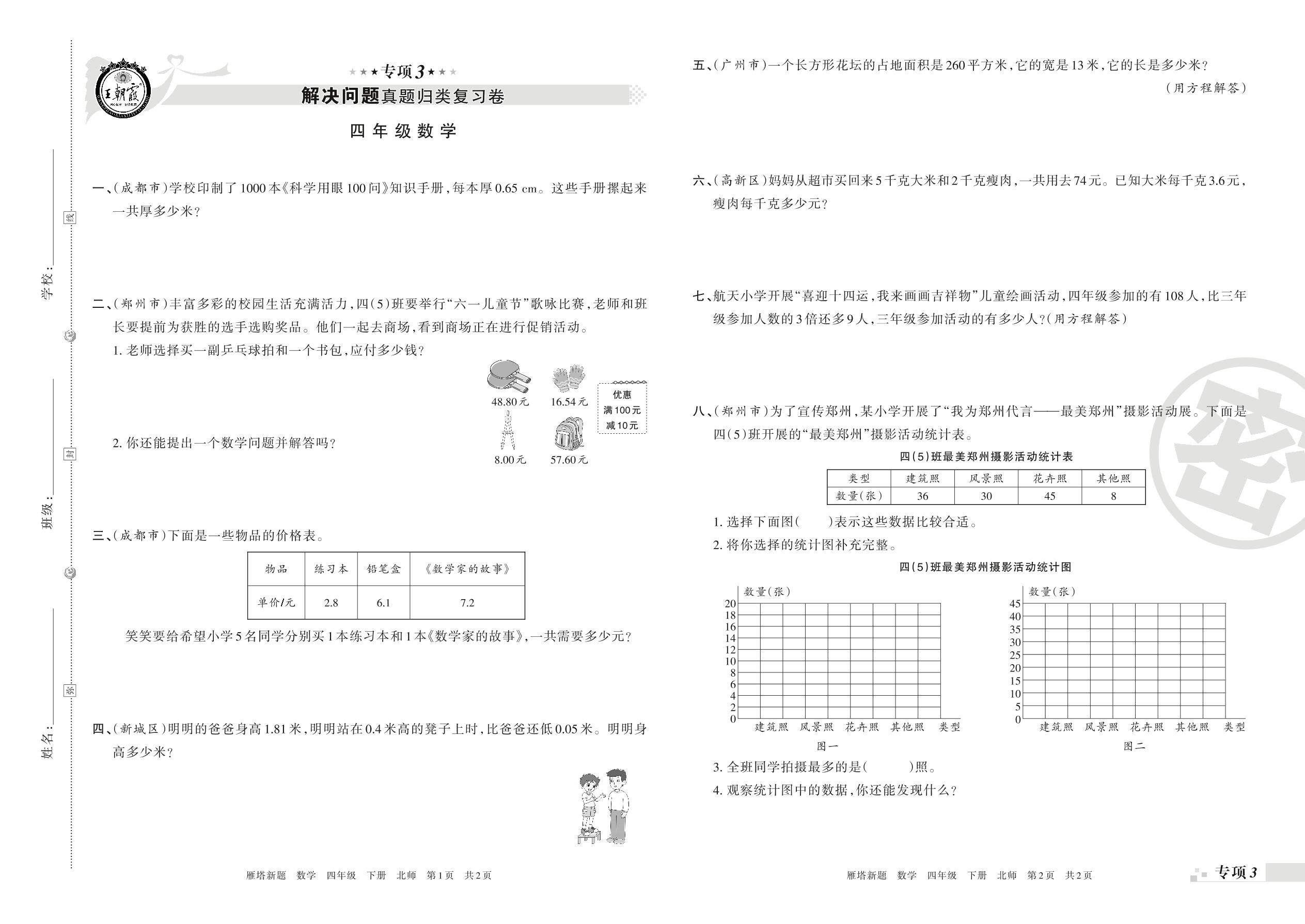 王朝霞期末专项卷——解决问题真题归类复习、新颖题速递:生活与数学四年级下册数学(北师版)_R210804133821【0】