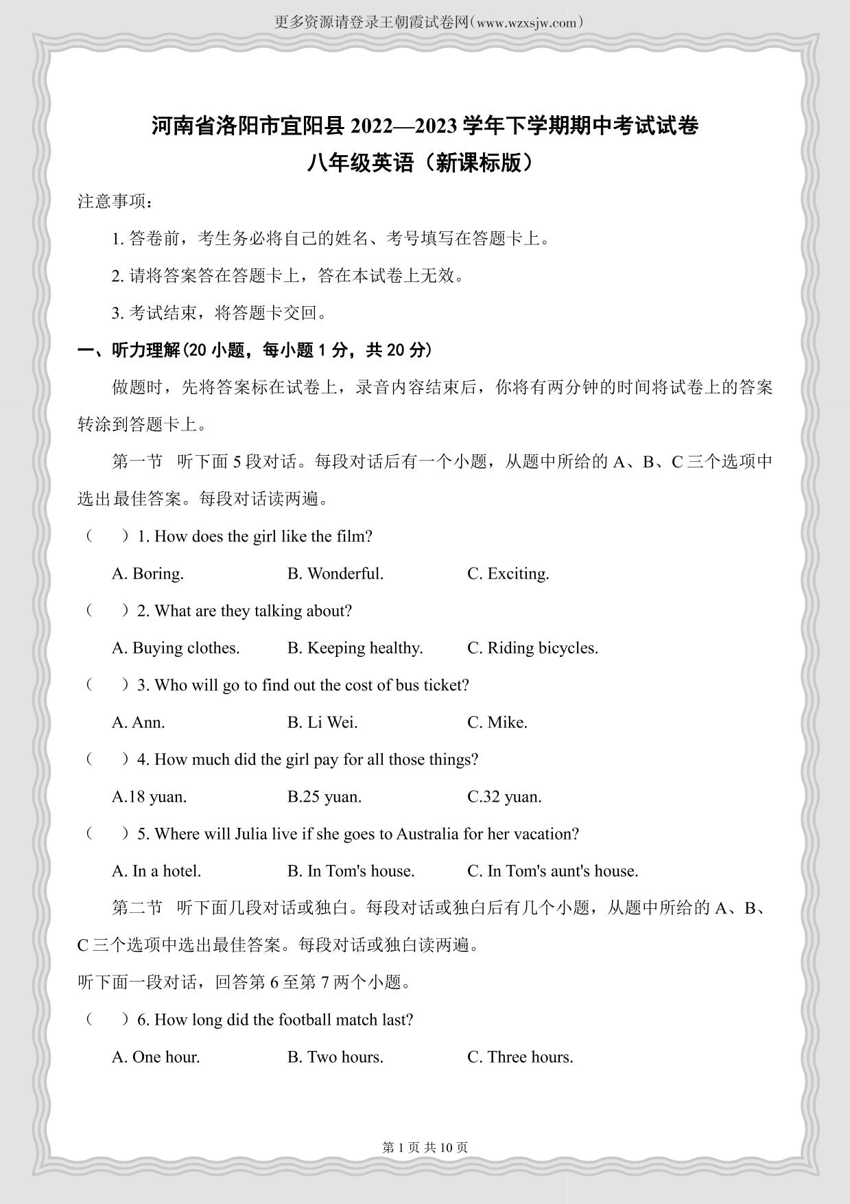 河南省洛阳市宜阳县2022—2023学年下学期期中考试试卷八年级英语(新课标版)