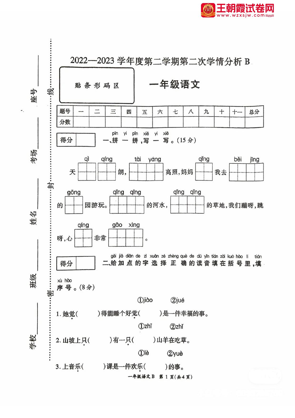 河南省安阳市2022-2023学年度第二学期第二次学情分析(期中)一年级语文B卷(人教版)
