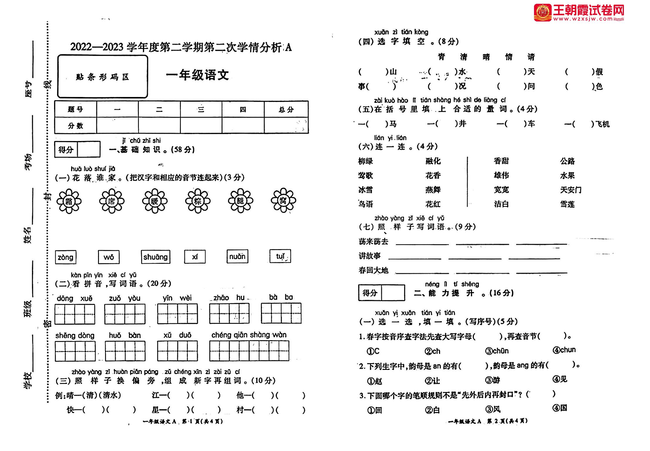 河南省安阳市2022-2023学年度第二学期第二次学情分析(期中)一年级语文A卷(人教版)