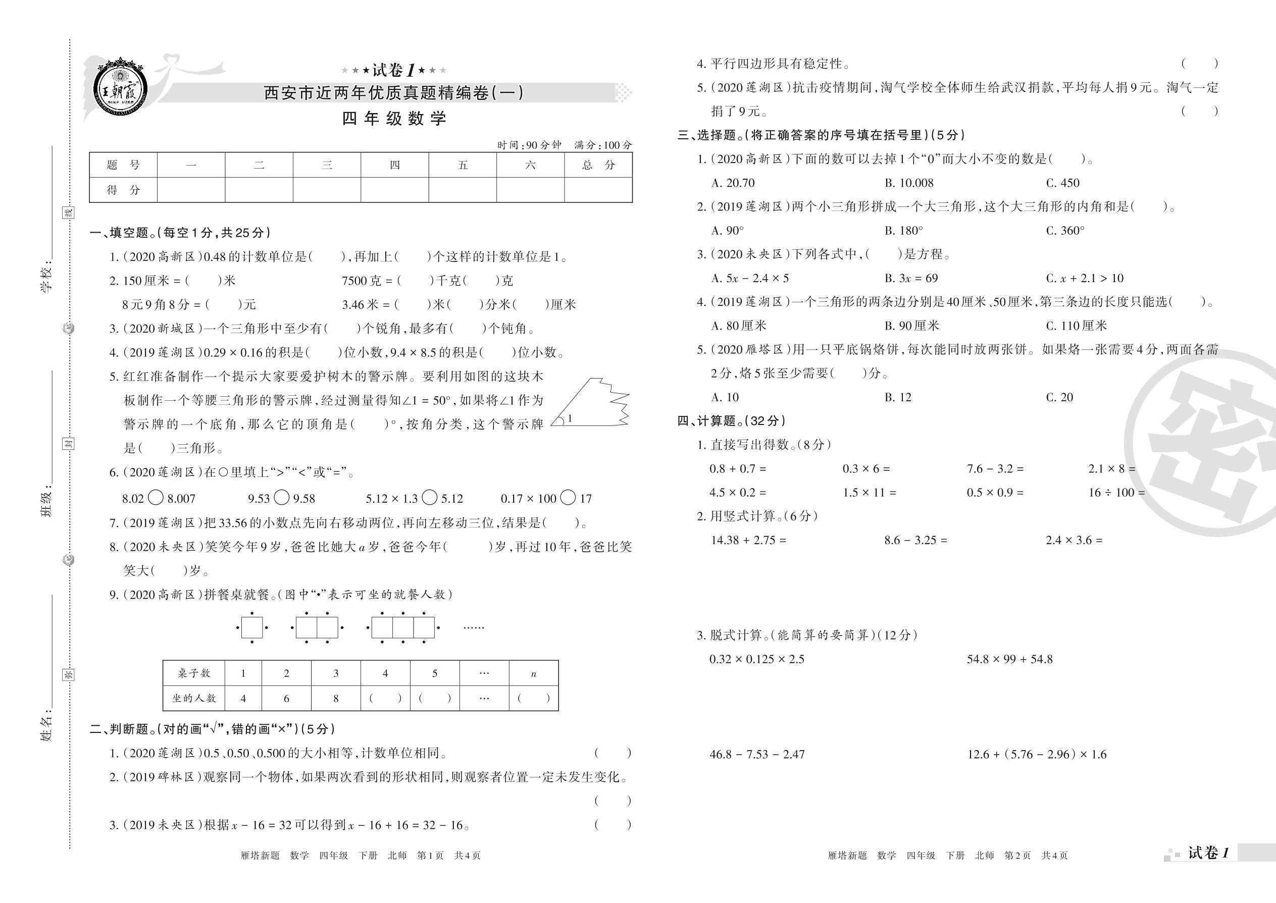 四年级数学北师版下册期末卷