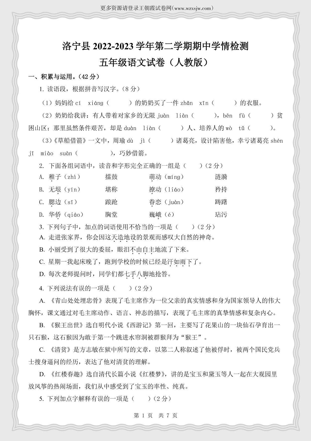 河南省洛阳市洛宁县2022-2023学年第二学期五年级语文期中考试试卷(人教版)